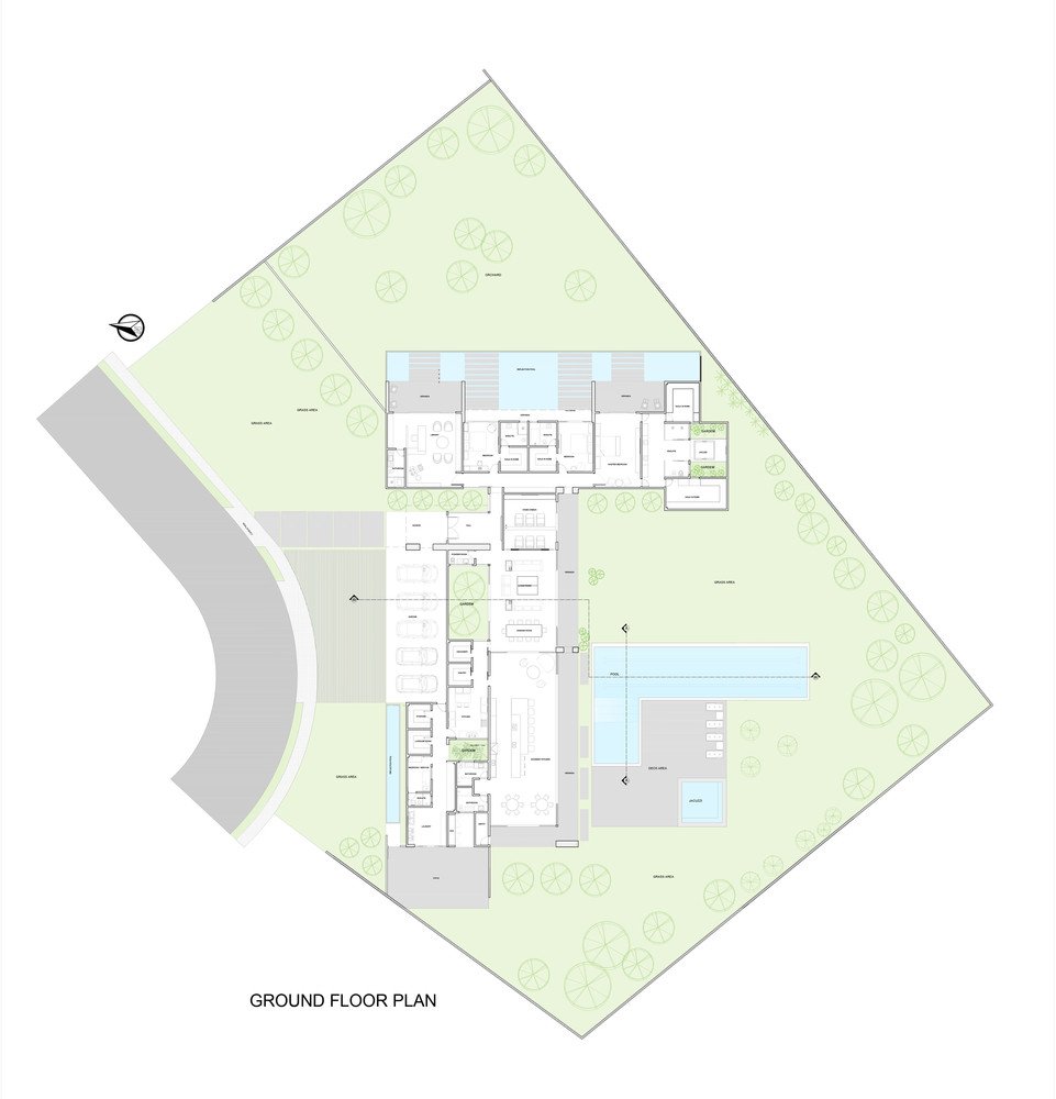 To take advantage of the natural slope of the land, we created a fruit tree grove at the lower level. This means that the bedroom volume facing the grove is suspended above it. As the clients like water features, we also designed a pond at the lower level featuring concrete walkways supported by central pillars that look as if they are floating.