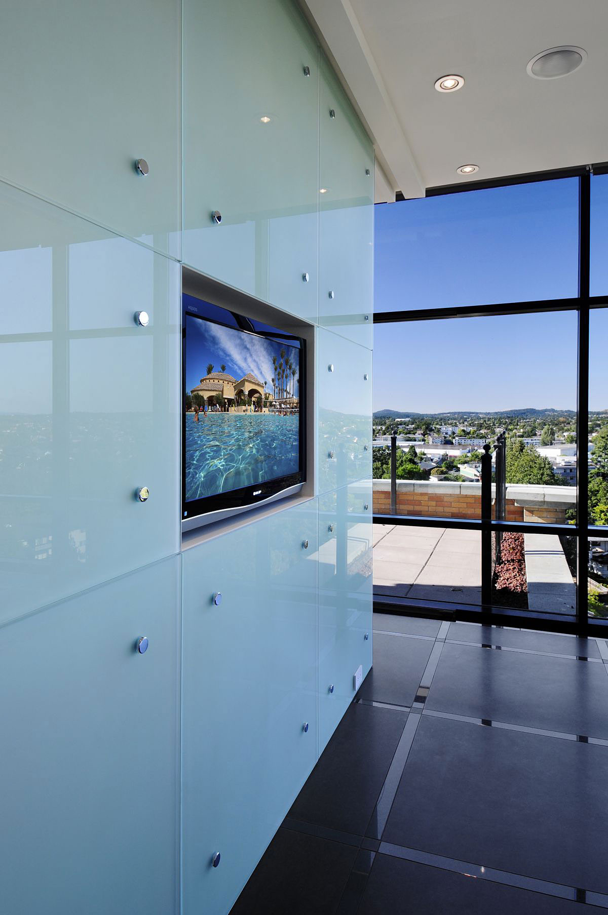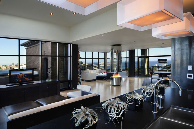 Luxe finishes give this home an air of sophistication, while also working as perfect backdrops for all the fine furniture that can be found throughout the entire place. The designers used granite for the floors, honed granite for the counter tops, custom hand-burnished plaster finishes in the Powder Room and on the large column, mirror-polished stainless steel for the 360° fireplace, stainless steel appliances, and anthracite stained millwork in the kitchen.