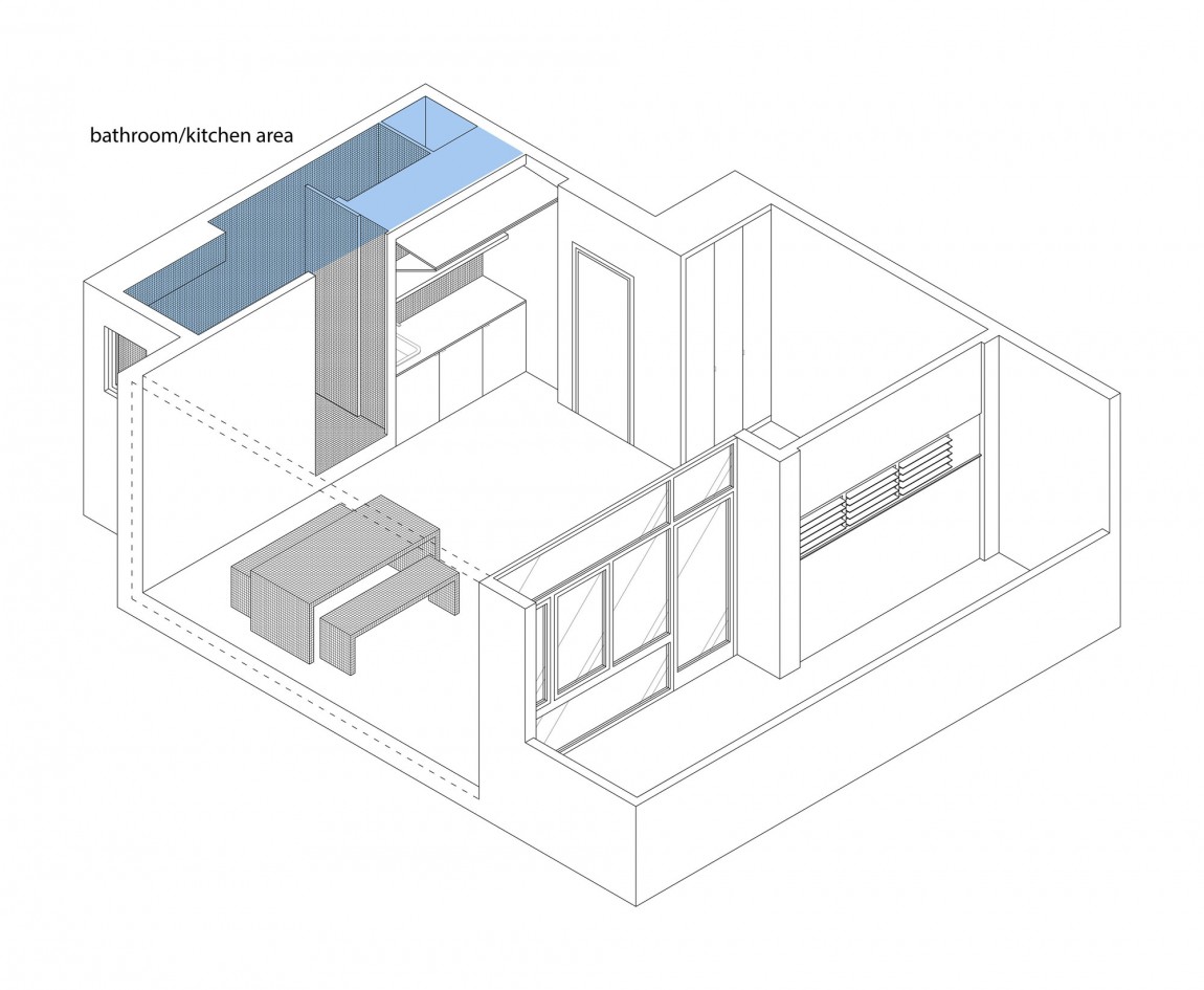 The client envisioned a peaceful, open and essential space, furnished with a few carefully selected objects; contemporary artworks, some books, and his records. In sum, a peaceful place for introspection, flooded with light. An extremely reduced budget asked for simple, inexpensive solutions The space is conceived through three different blocks: the bathroom/kitchen block, the living/bedroom one and the third, external, the terrace. The last two are extremely permeable, only divided by a large window and a long, oversized louvers one on the bedroom side, both existing elements that were preserved. The big opening connects a small terrace (11 square meters), unified with the interiors through the use of the continuous white resin flooring and a blank parasol that provides privacy while diffusing the daylight. Indoor and outdoor are therefore connected as a continuous living space.
