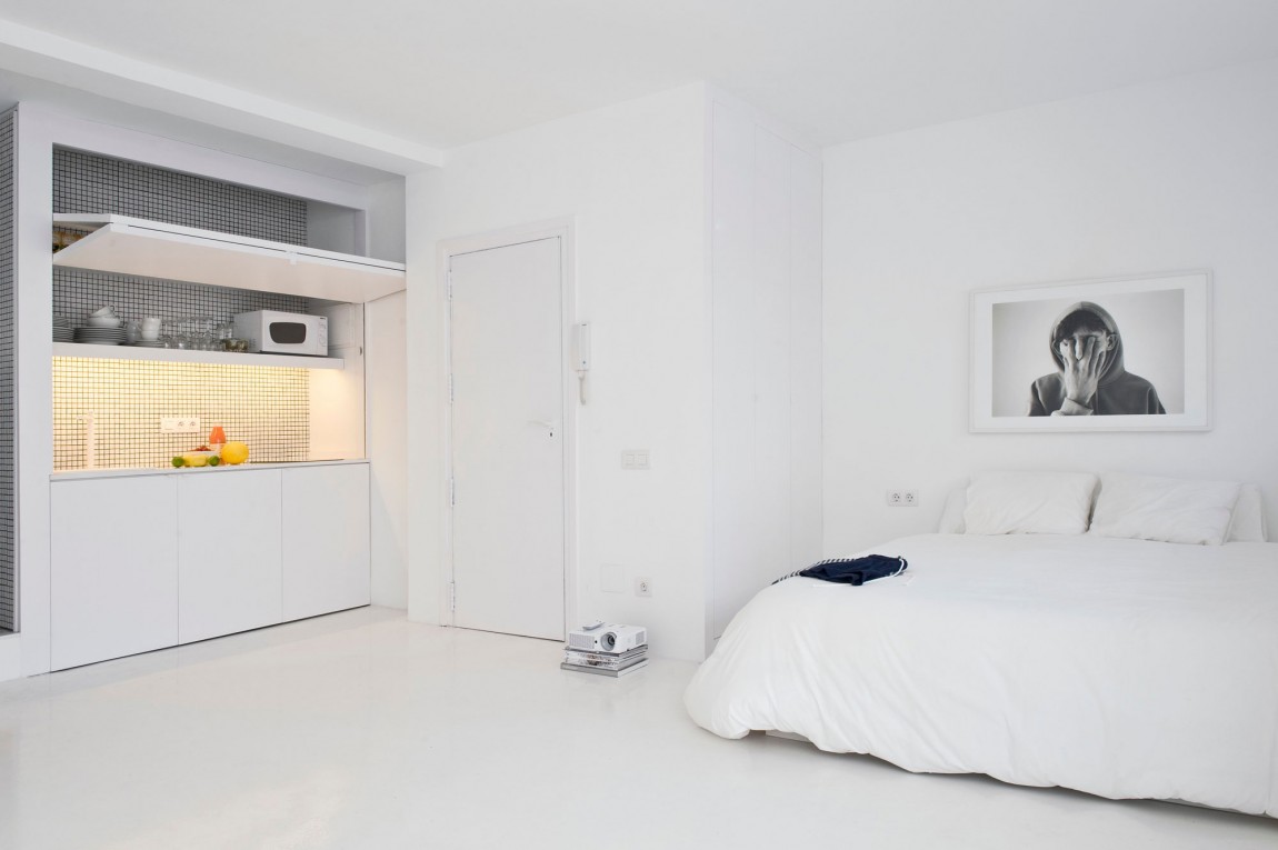 The renovation of this 36 square meters (387.5 square feet) apartment came with a defined brief. The client, a French Art historian and curator, professor at the Sorbonne University, came to us with very clear ideas for his small property. The apartment, located in the city centre of the coast town of Sitges (a few steps from the beach) is completely introverted, facing only an interior courtyard. The lack of views is compensated by silence and light.