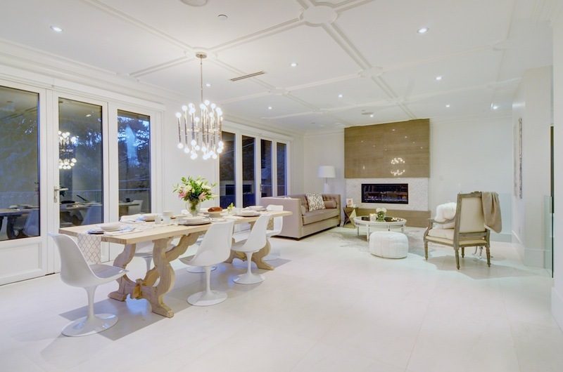 On the main floor we find a beautiful formal living and dining room area with French doors and a fireplace and a kitchen emphasized by custom finished oversized floors, quartz countertops and elite appliances.