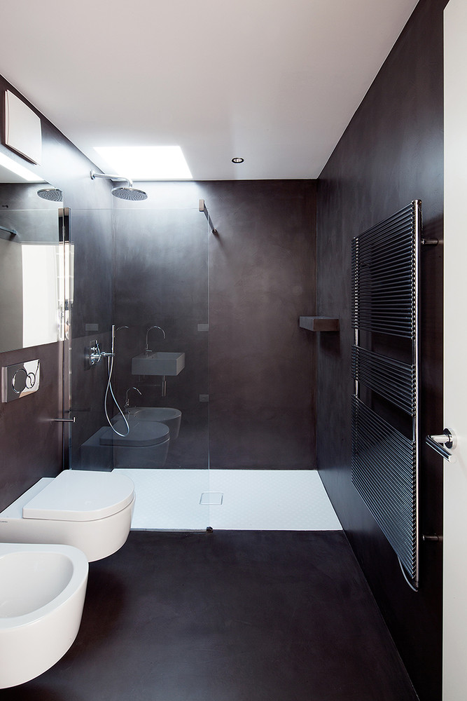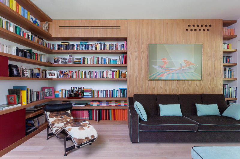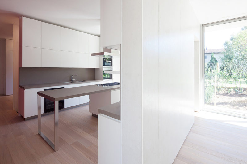 The metal sheet subtly working, resolves details related to dripping water. The formworks, thanks to a system created ad hoc for the house, hide the join marks so that the aesthetics of the cement walls are not compromised and to allow the parquet floor to be recessed without the need for a skirting board.