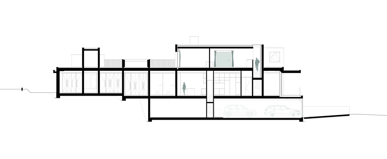 The plan involves an interchange of open glassed areas and enclosed volumes to house the technical and service zones as well as the closed rooms such as the study. From the entrance, positioned just over two metres from the road, a long corridor crosses the entire main floor, broadening as it reaches the sitting room and dining area. The house is a system that is reflected in the spaces. Villa G has been designed so as to permit all the internal areas to open onto the wood: allowing architecture to become an environmental filter. A central patio increases further the important relationship between inside and outside.