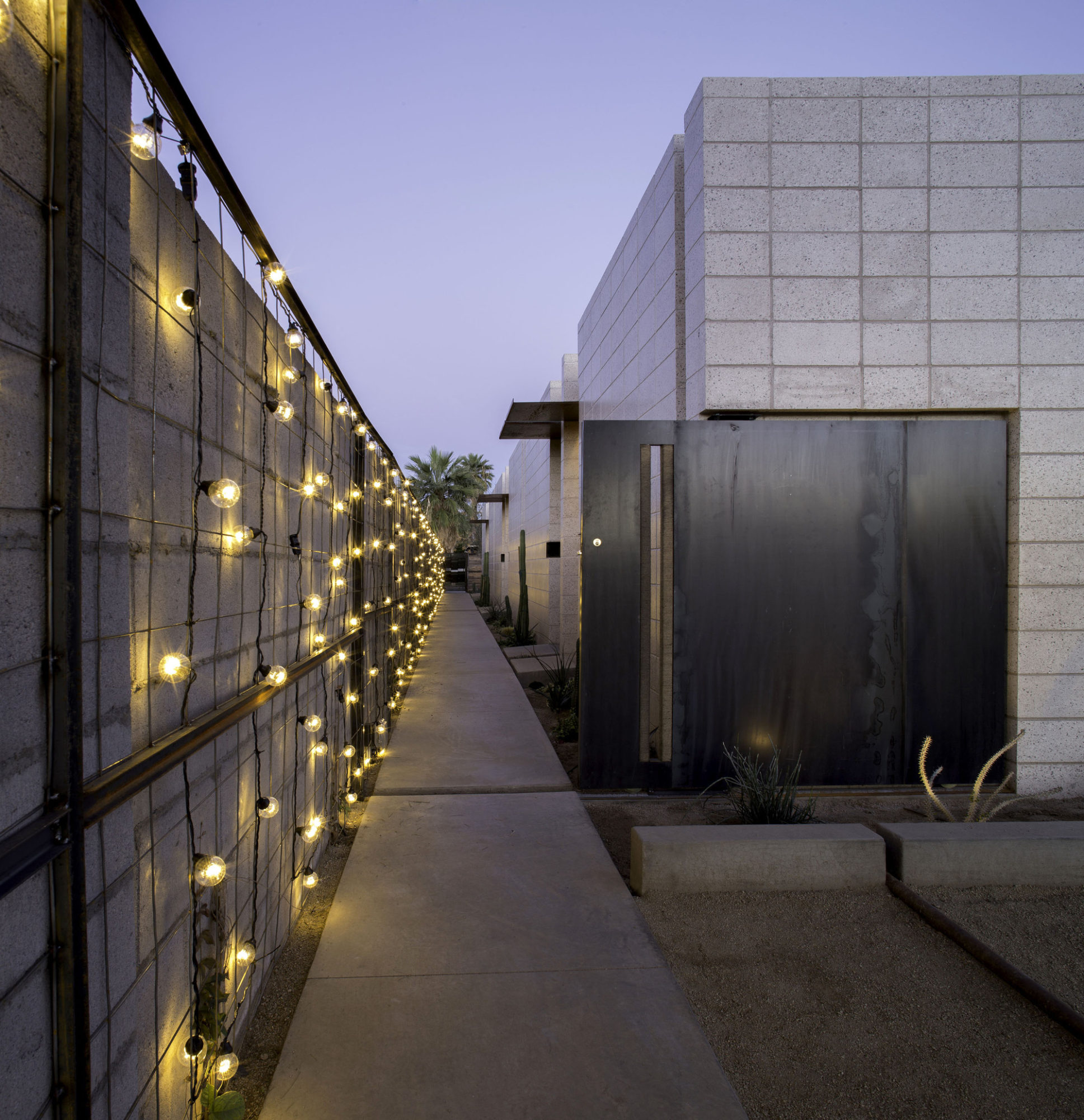 These two approaches help reduce heating and cooling costs in the Sonoran desert climate. Custom oversized white oak doors welcome renters to their units, while aging raw steel awnings protect residents from the elements. Hall designed and fabricated all steel components – some of which were built years prior to breaking ground, like this custom door jam, deadbolt and mail-slot piece. The rough wood fencing that wraps the perimeter of the complex is constructed of pallet wood that Hall reclaimed from existing job sites around Phoenix.