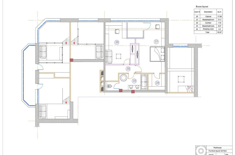 The apartment was divided according to the owner’s specifications so that all family members could benefit from their own private space. Decorations include warm, welcoming colors and contrast beautifully with the custom-made furnishings and the upholstery.