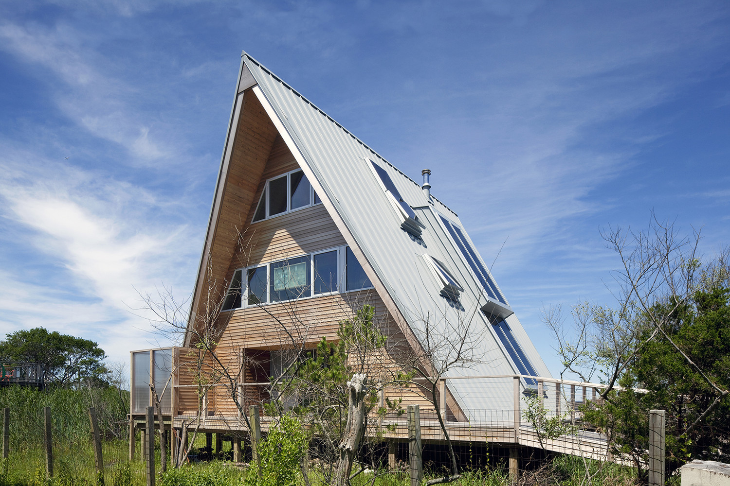 On a stunning site with panoramic water views and wonderful exposures to the changing light of the day stood a typical 1960’s, three story A-frame. The derelict structure had a tight spiral staircase splitting the middle, four dark bedrooms, a leaky roof and a cracked pile foundation. These were the conditions overcome in this dramatic, open, expansive, light-filled renovation in Fire Island, New York.