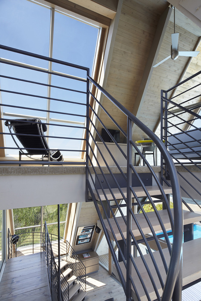 Bromley Caldari Architects were tasked with renovating an older A-frame residence from the 1960s. The house is located in Fire Island, New York, and it initially featured a tight spiraling staircase, four dark bedrooms, a cracked pile foundation and a leaky roof. However, the architects managed to transform it into a light-filled and welcoming home, particularly as they redesigned the staircase that blocked light and limited the views towards the outdoors.