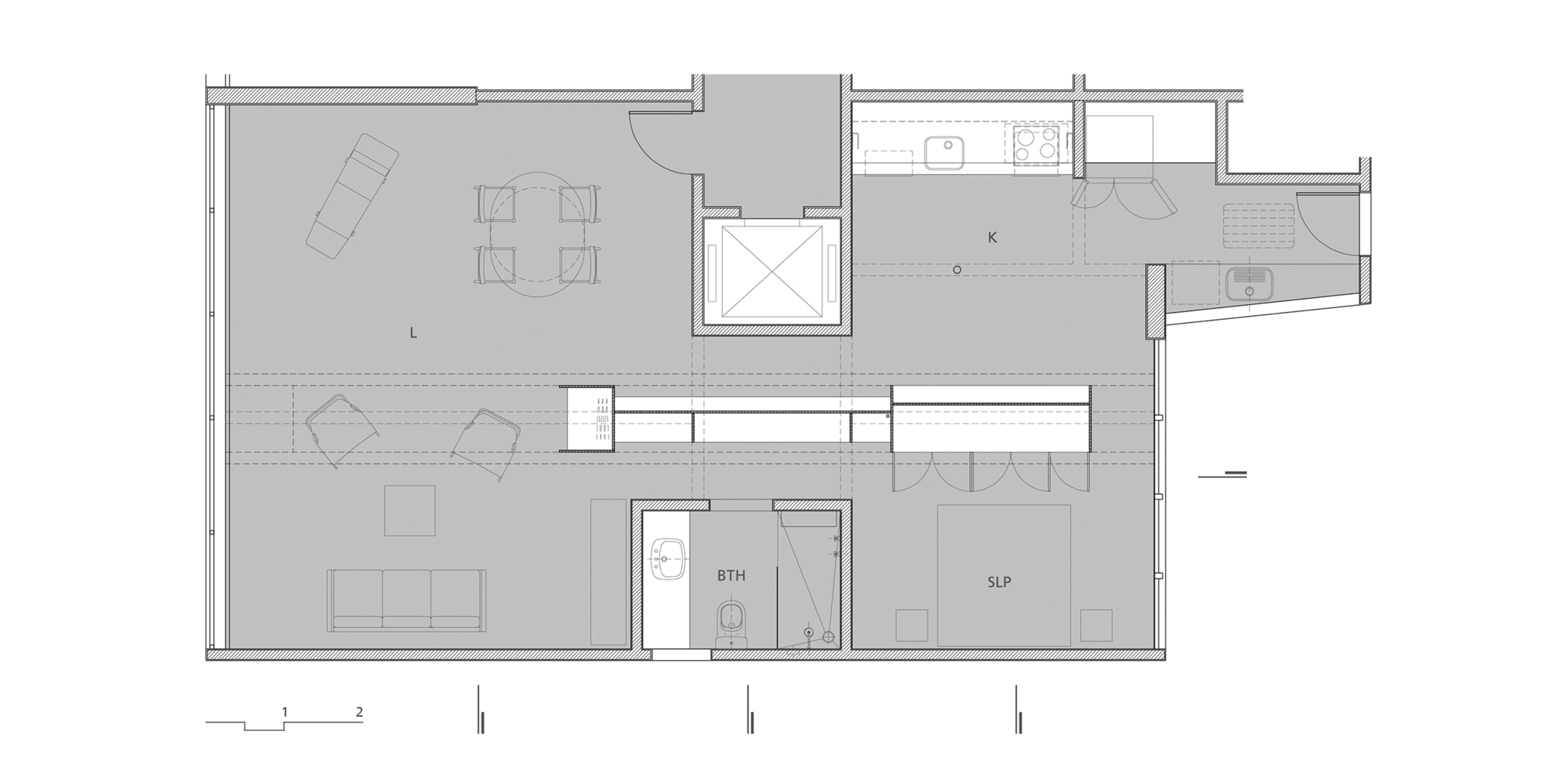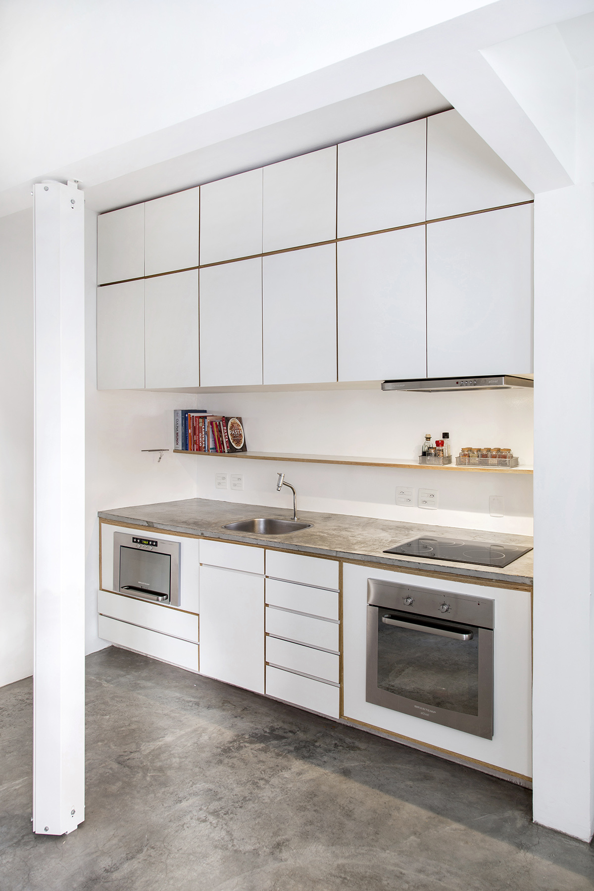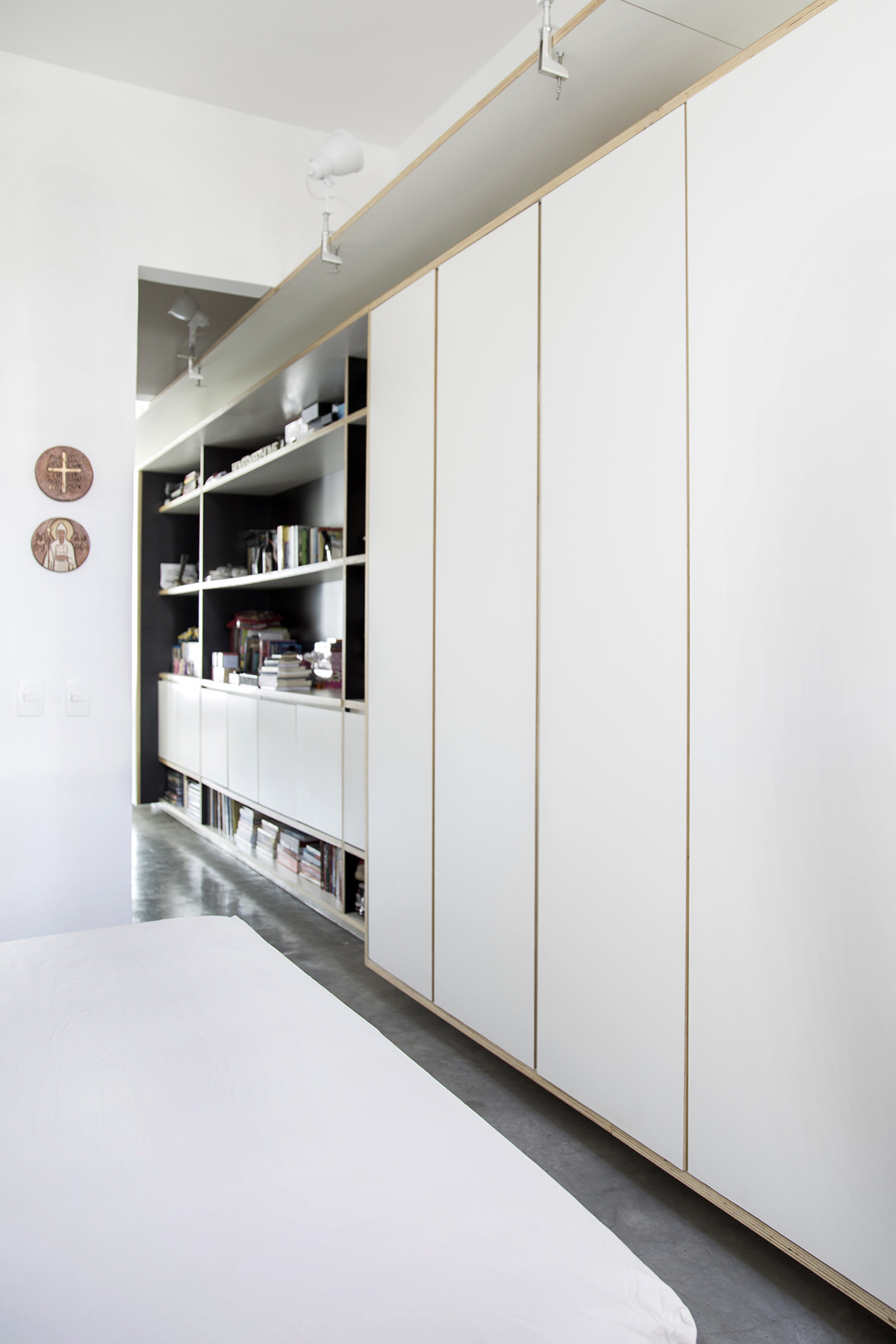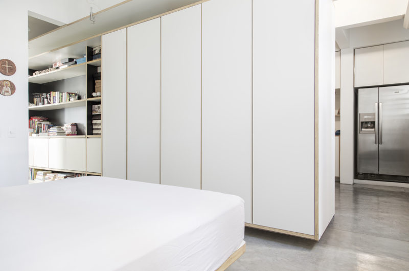 The renovation involved the expansion of the living room by eliminating one bedroom as well as the merger of the employee room with the kitchen. All of the rooms within the apartment are linked by a central plywood closet, which fulfills different roles. For example, it acts as a storage unit in the kitchen, a closet in the bedroom and a bookshelf in the living room.