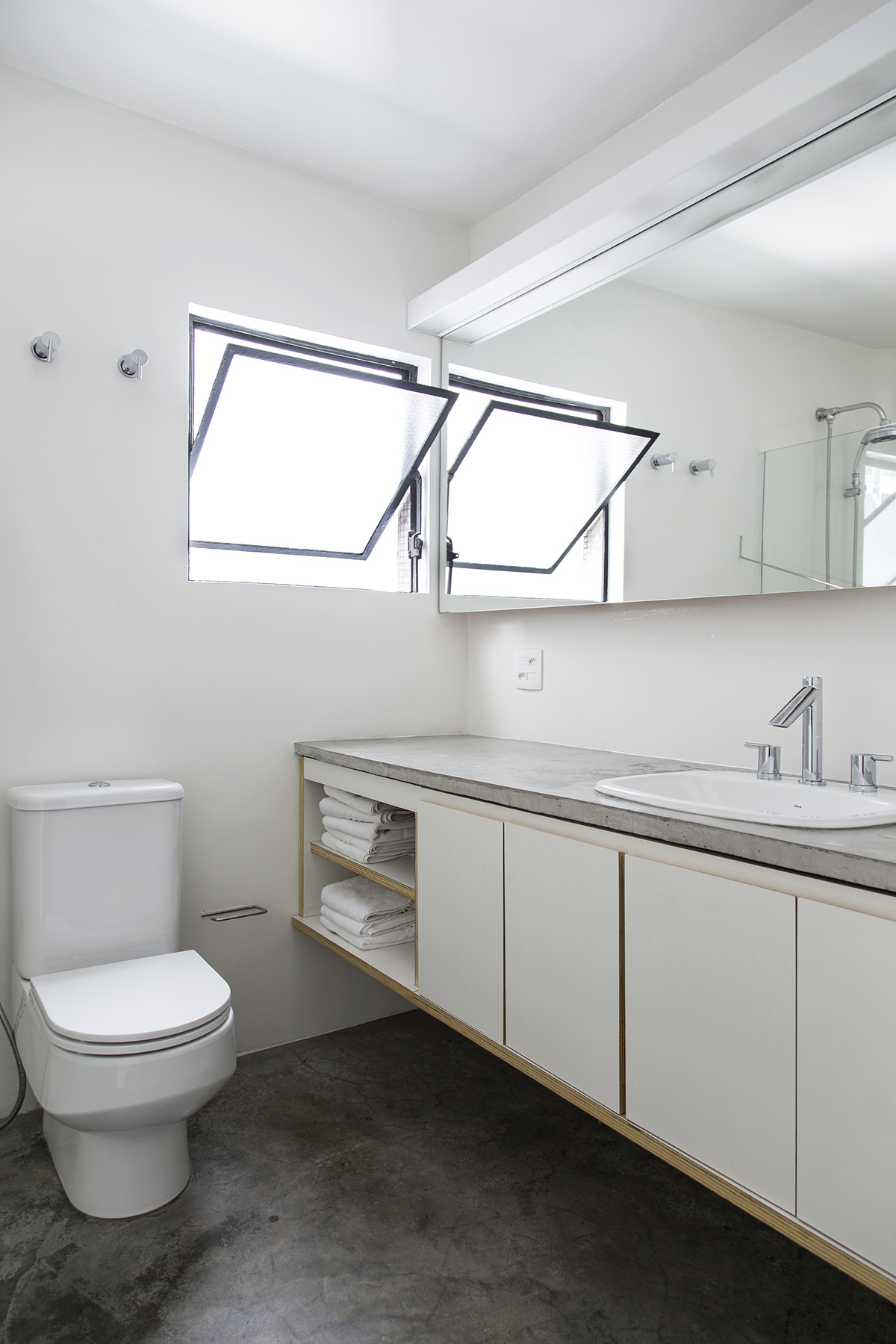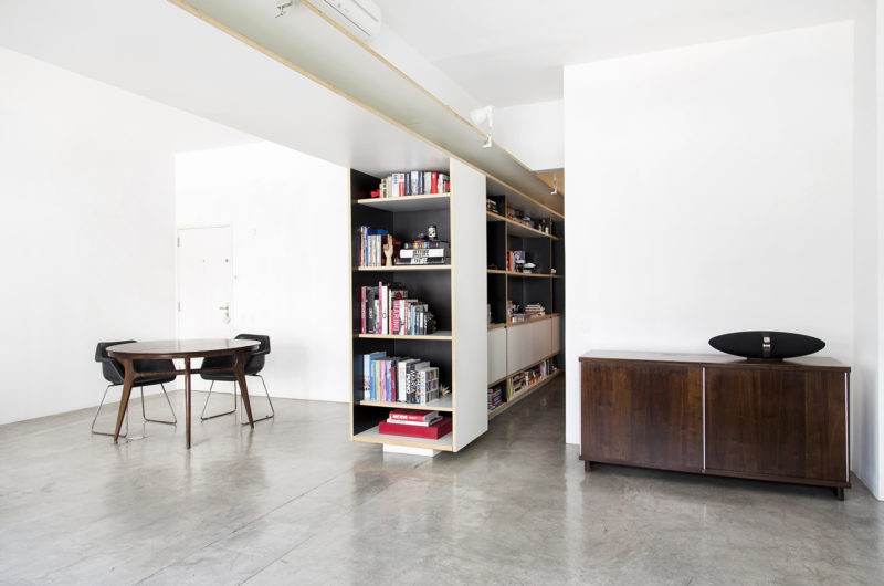The inner walls of the apartment have been demolished and the original unit, composed by two bedrooms, living room, kitchen, bathroom, laundry area and small room for employees, has provided a unique space organized by the volume of a closet. One of the bedrooms has been removed to double the size of the living room. Likewise, the employees room has been joint to the kitchen.