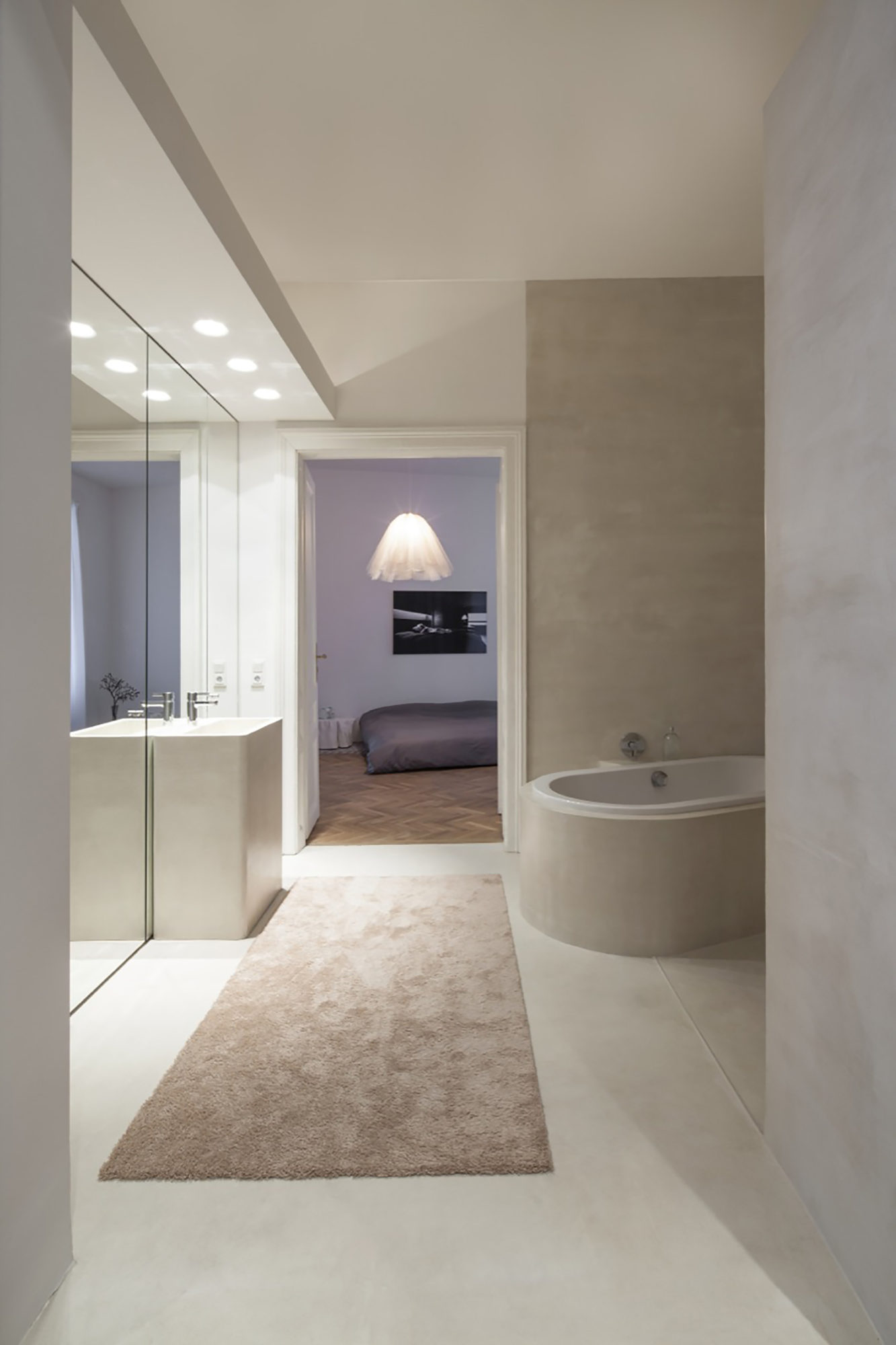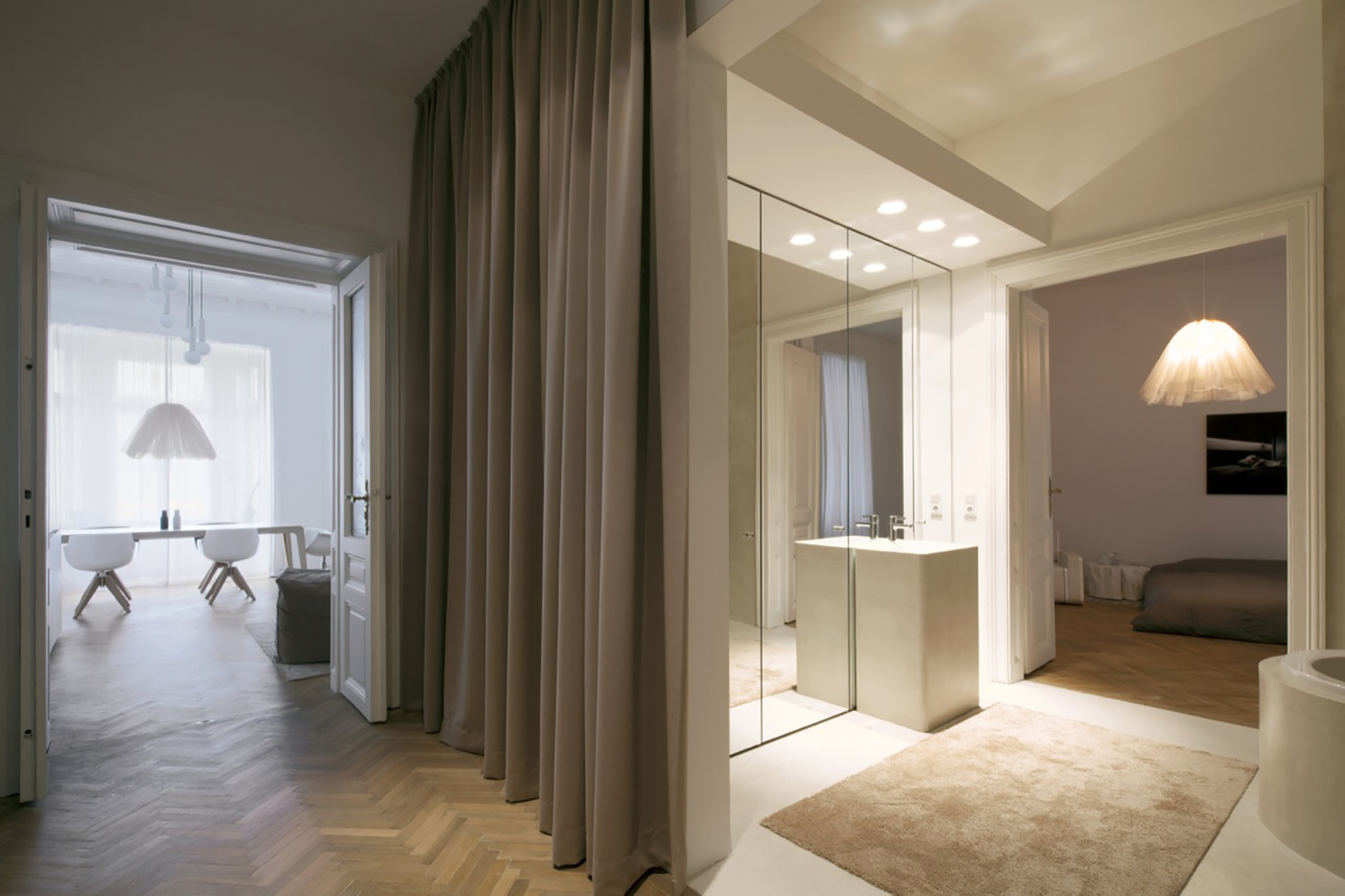 The former entrance area, which included a bathroom and a cloakroom, was transformed into a lavish wellness-bathroom with a sauna. The wall separating this bathroom from the new foyer was removed and replaced by a curtain, which can be closed if needed. The bathroom’s walls as well as its floor and washbasin were smoothed and sealed with a white tile-adhesives, creating a homogenous, monolithic and virtually joint-free spatial structure.