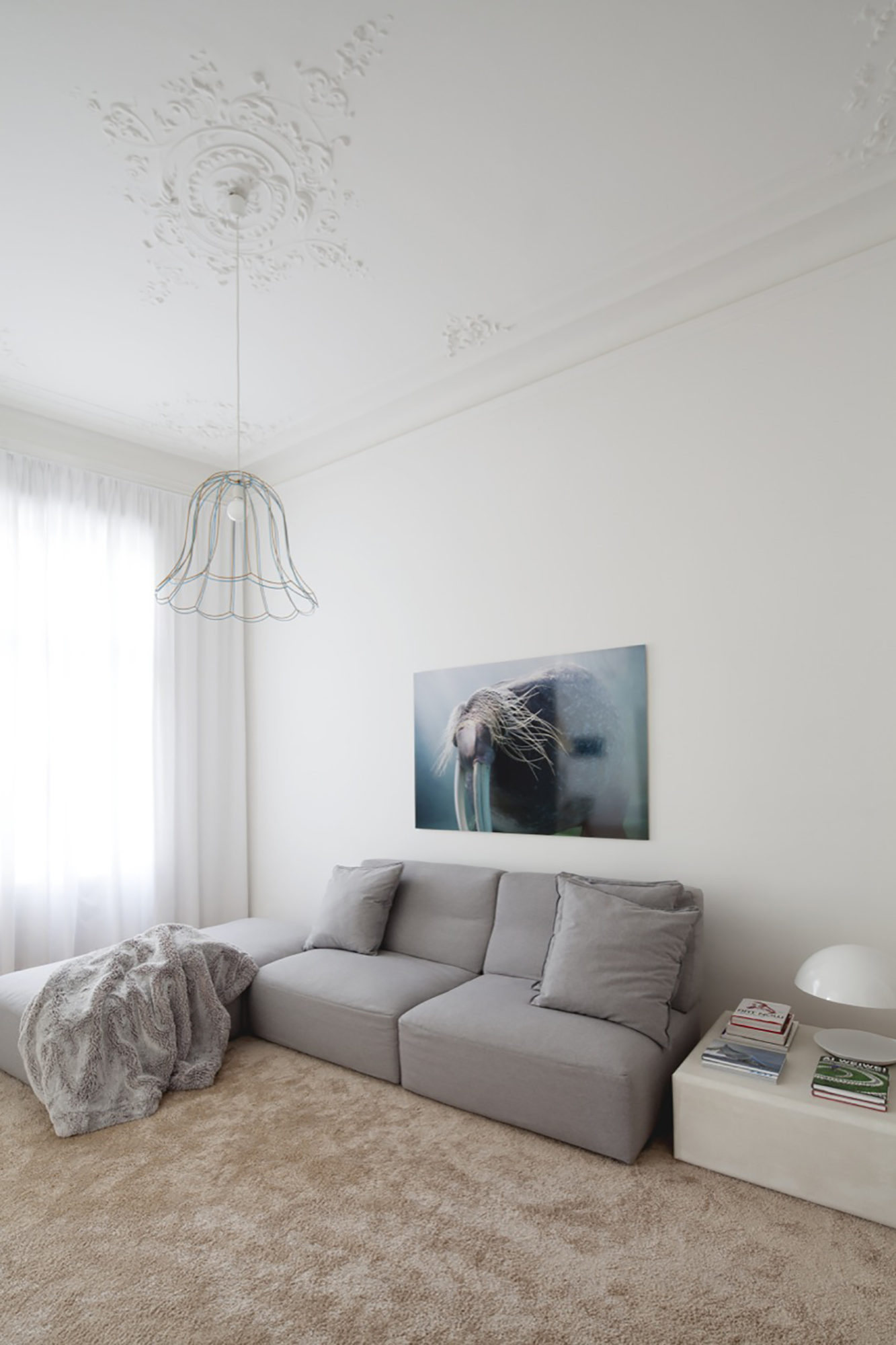 As far as the parent’s bedroom is concerned, the architects expanded it by joining it with an adjacent smaller room. The build-in closets of the bedroom are hidden from sight by floor-to-ceiling curtains that also add a touch of elegance and mystery. Some of the furnishings were supplied by destilat, while others were designed by the owner. The client’s wife sketched out the wonderful tulle-chandeliers found in the children’s room and above the dining table. An innovative twist comes in the form of impressive “Shades of 3D” lamps, which were placed in the bedroom and living room.