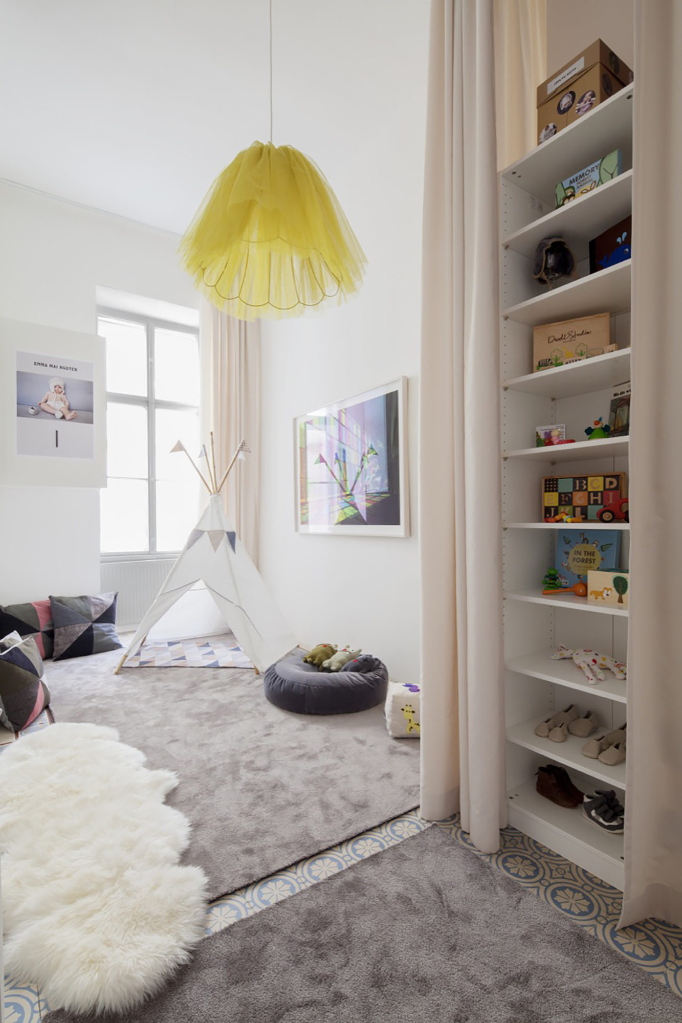 The restoration and uncovering of the apartment’s original cement tiles in the children’s room and in parts of the bedroom accentuates these areas in a colourful way, contrasting the concept’s otherwise primarily simple and bright colours.