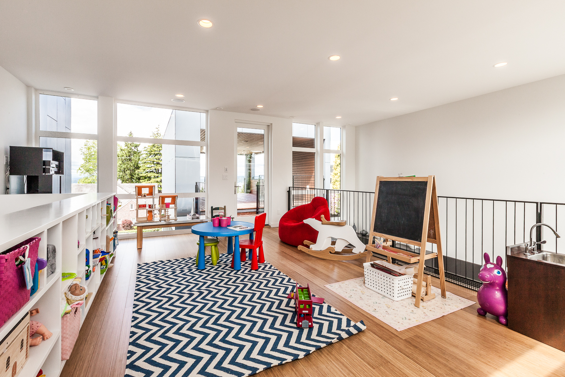 The third floor has a second mater suite, a kids play room, and a covered roof deck with views over Puget Sound.