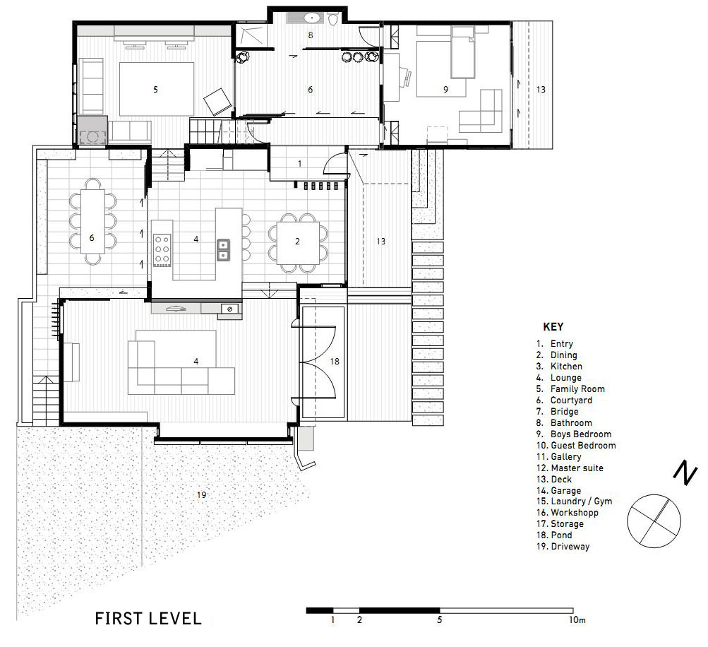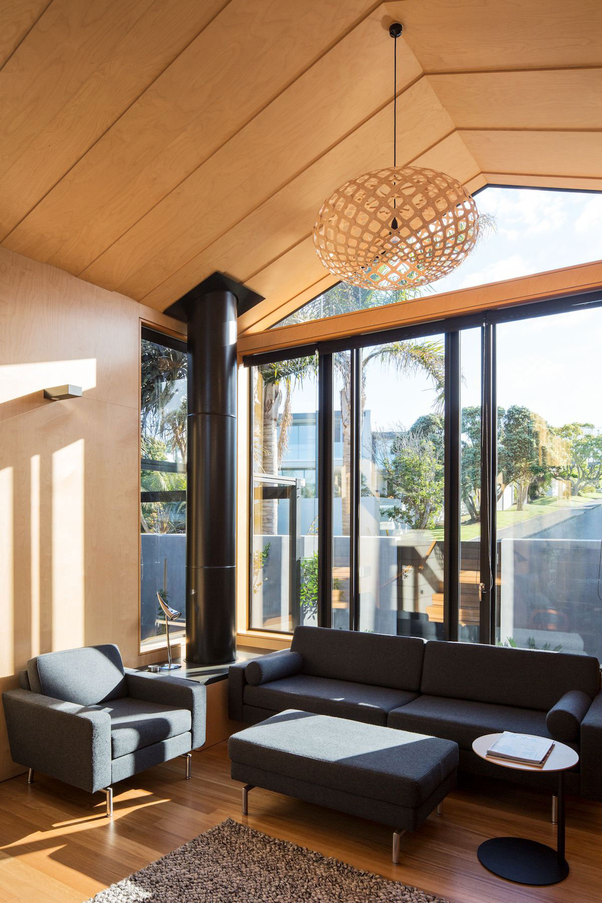 The corner site, challenged by two 5m (16.4 ft) front yards and the blunt presence of a three-storey neighbour hard on the North-West boundary, stimulated an approach of layered complexity with ample transparency to capture light, sun and glimpses of the pohutukawa and baiting ocean.