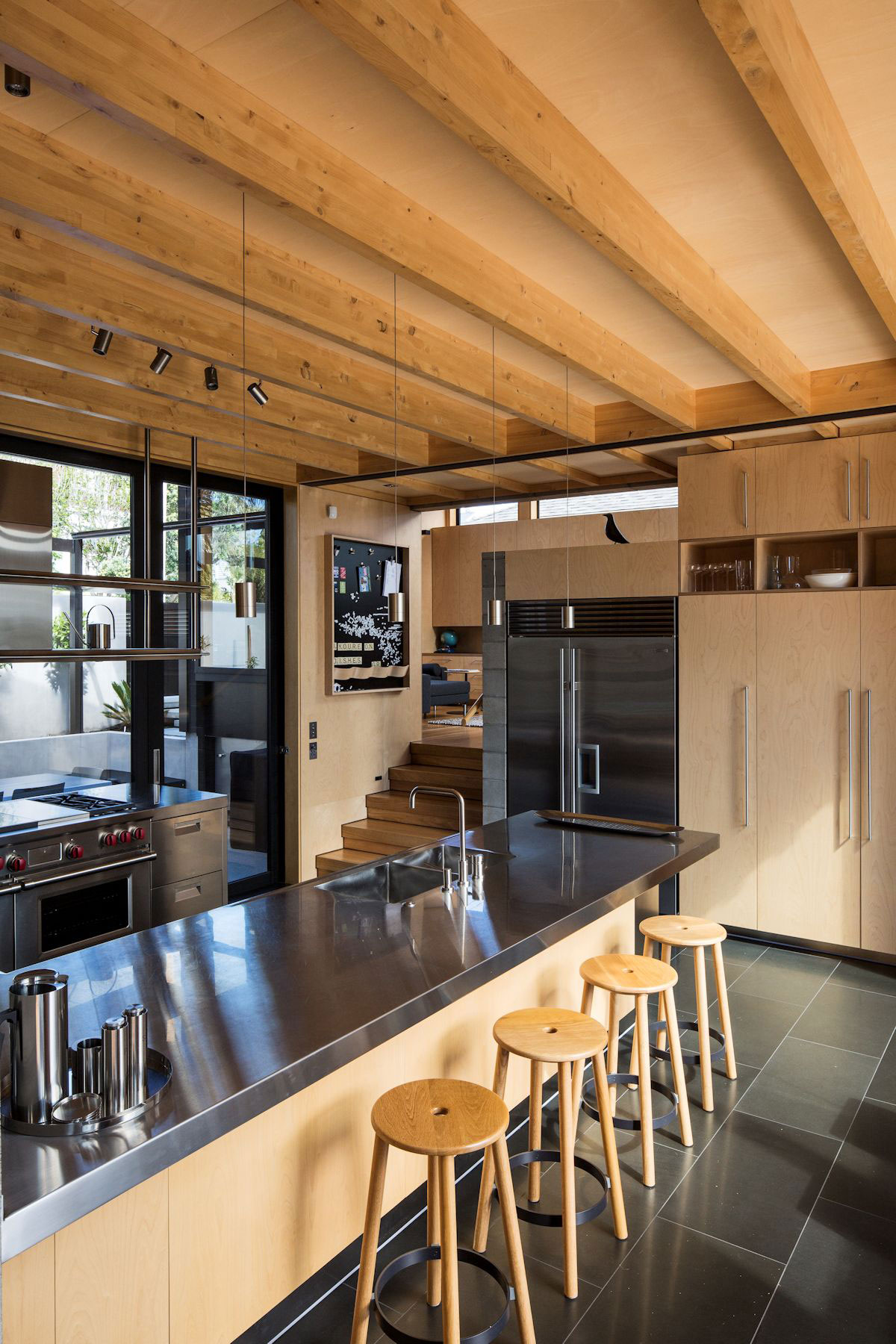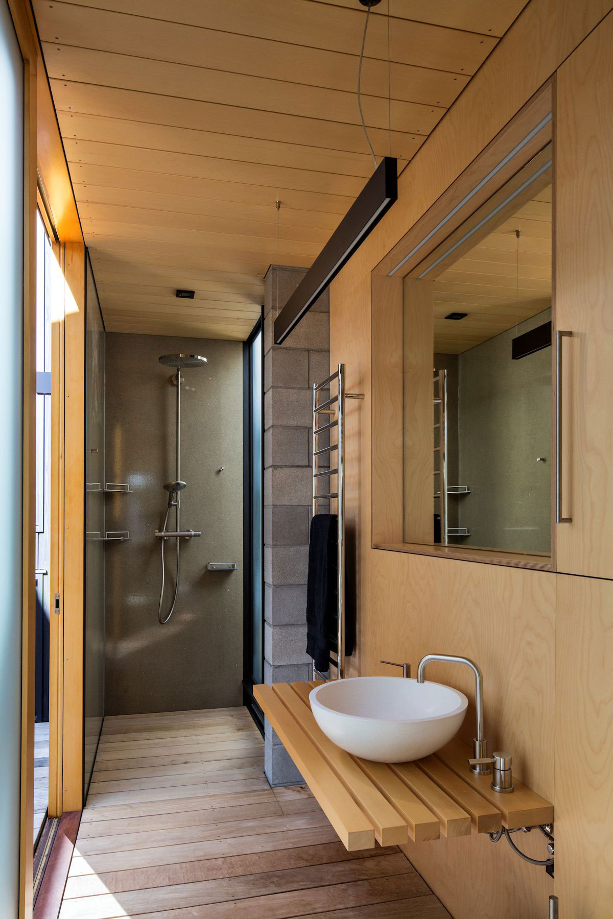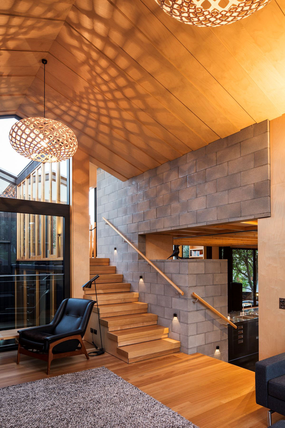 Simplicity of the exterior form is contrasted by the highly crafted timber interior, exhibiting the skilled artistry of the builder. A diverse succession of multi-connected spaces create a threaded flow of movement, whilst each maintains a distinct and sequestered quality.