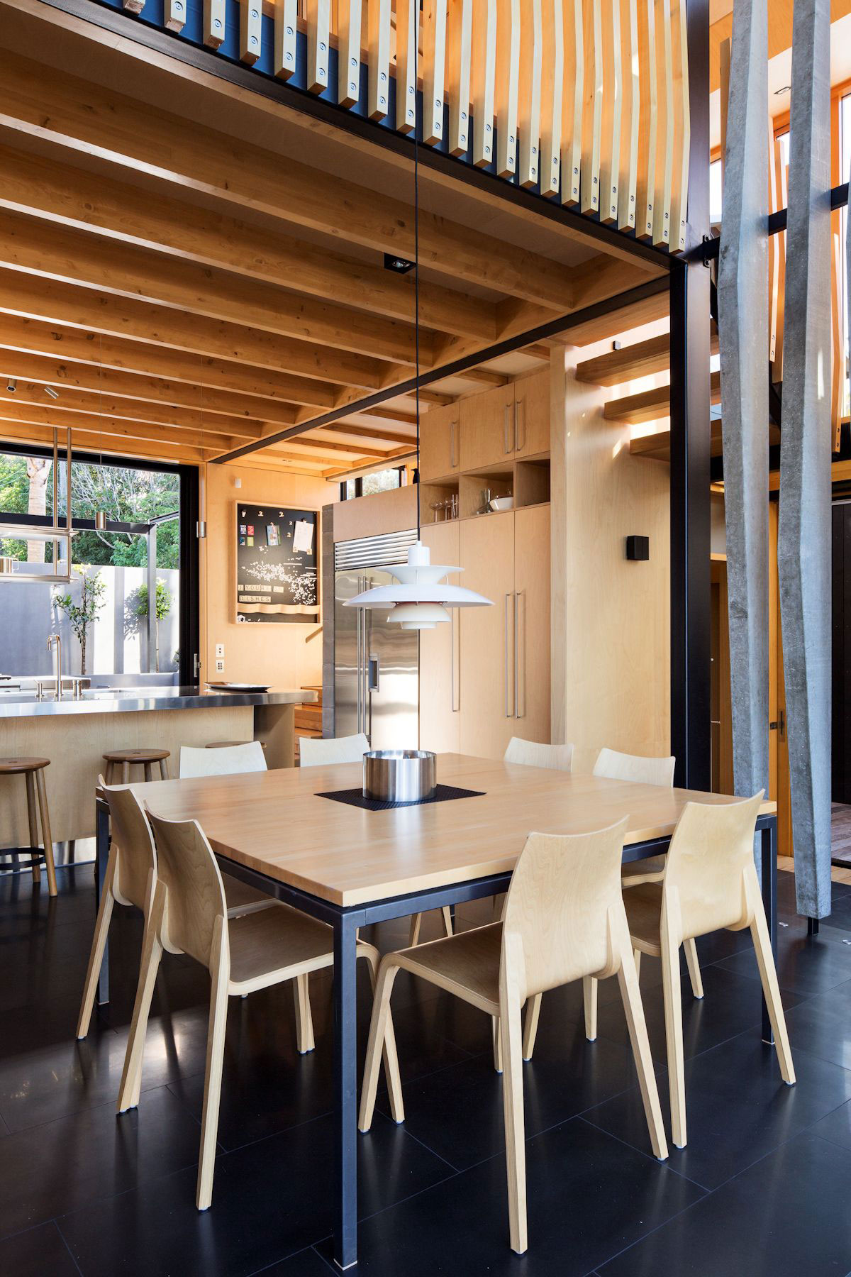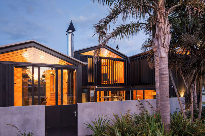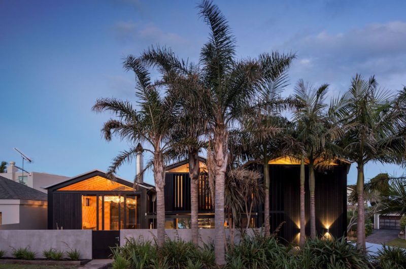 On a constrained, compact urban site, a stones throw from Takapuna Beach, the three-stepped gables of these black ‘boatsheds’ appropriately reference our boating and beach culture. The sliding forms reveal a solution beyond the standard connotations of a home, a bespoke incubator for the clients’ lifestyle.