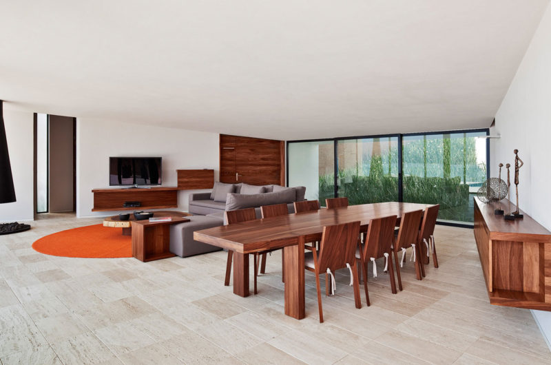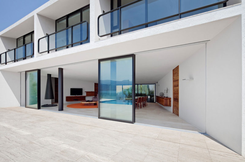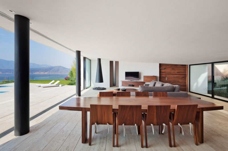 Its huge windows and glass doors keep the house permanently connected to the outside areas and facilitate a seamless transition between indoor and outdoor spaces. Several sun lounges and two outdoor swimming pools invite owners and guests outside for relaxation and fun.