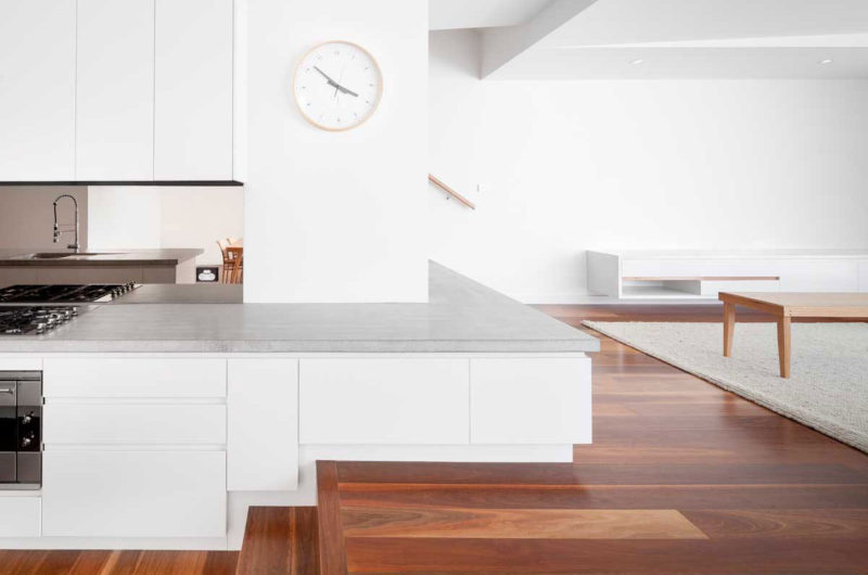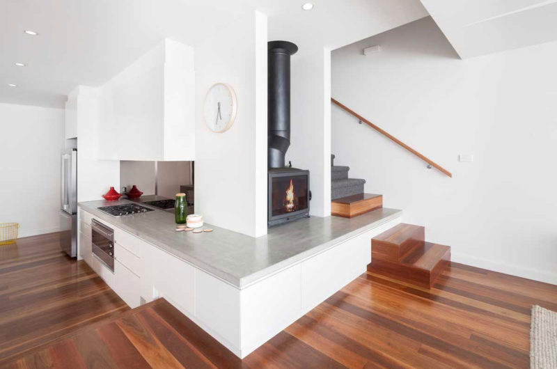 The brief was to transform an existing heritage listed double fronted two bedroom, inward facing house into a light filled two storey home for a young family, which can be opened up for social events and connect with the outdoors. Leaving only the front two bedrooms intact the design capitalized on the wide block by pushing the building mass to the south boundary and orienting the new entertaining areas around the north-west facing garden.The formal dining area and kitchen are located in the centre of the new volume, separating the living space from the two original front bedrooms. A few steps separate the dining and kitchen area from the elevated living space, while a single joinery element maintains continuity between the two levels.