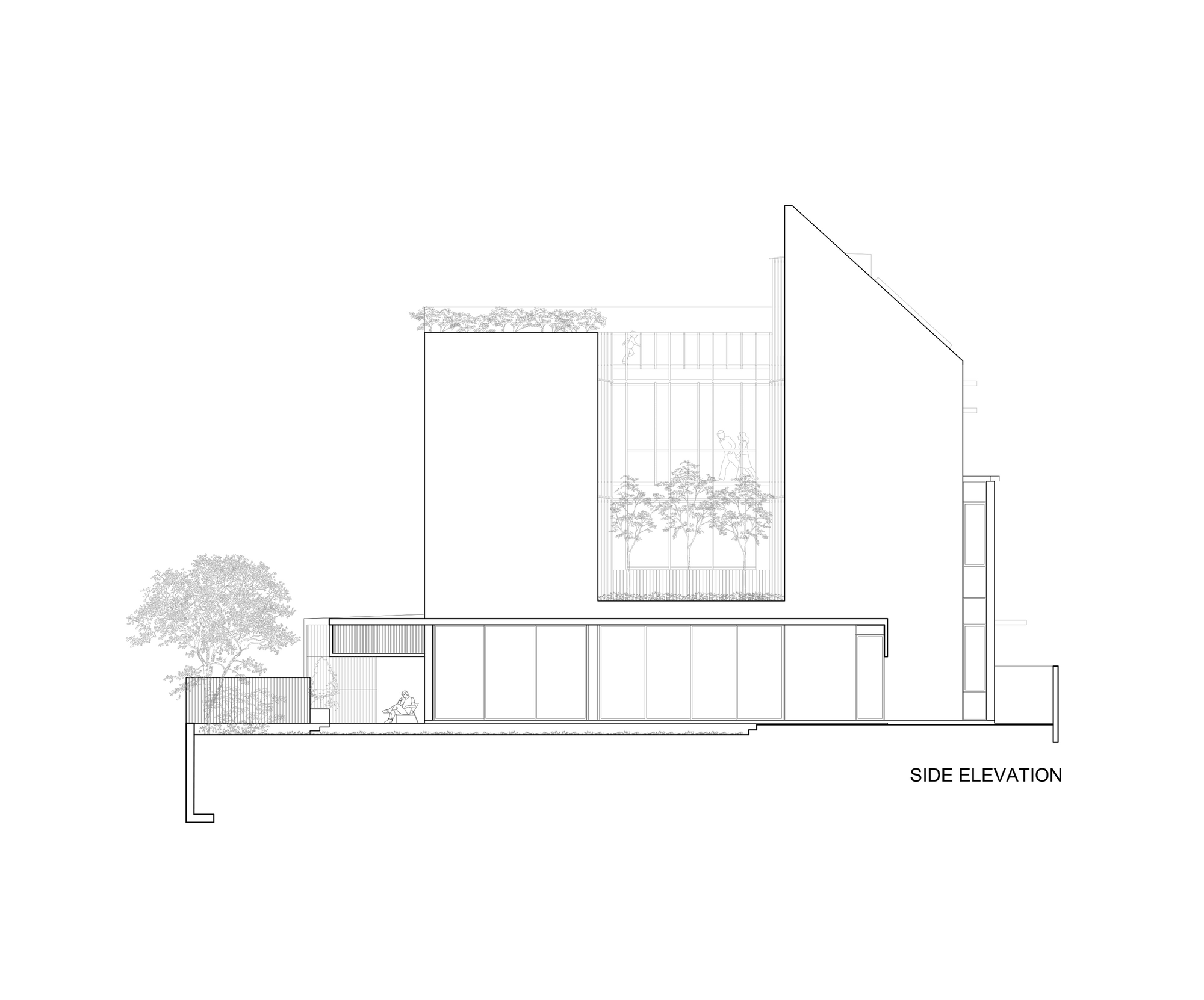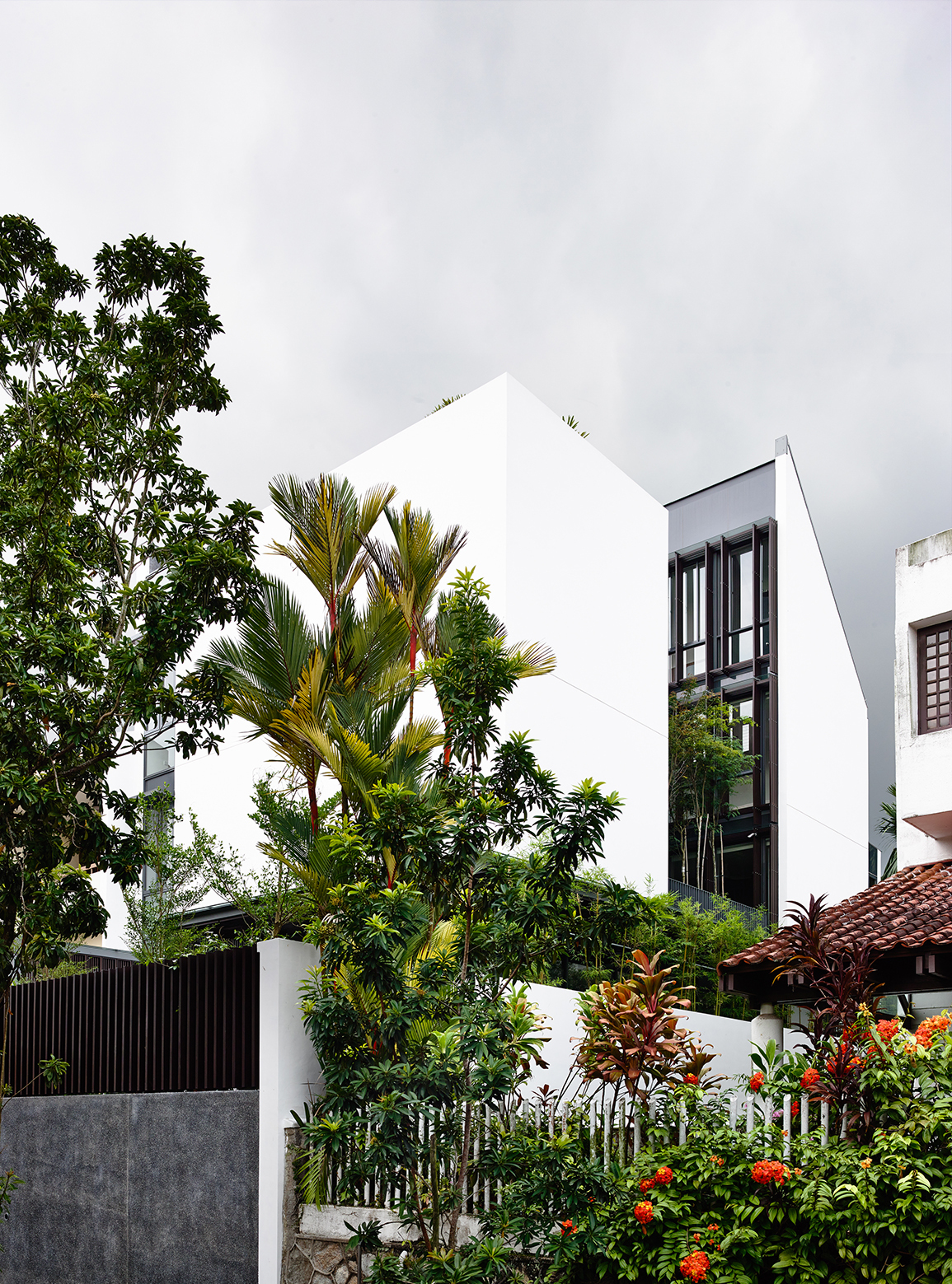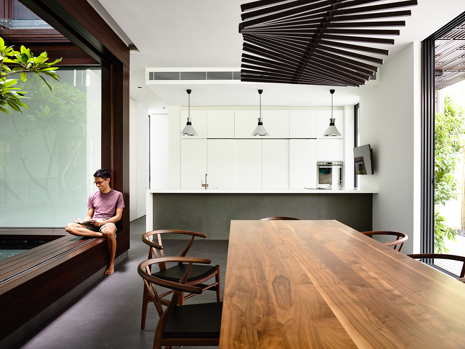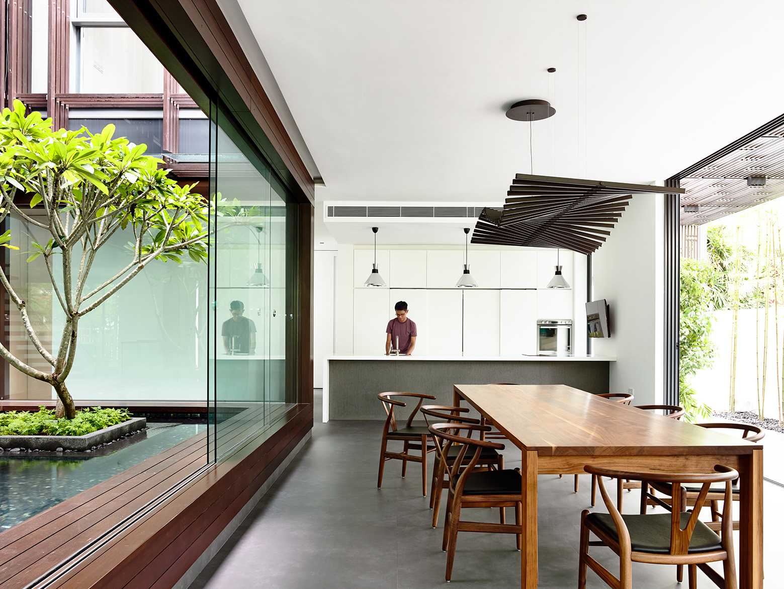 A courtyard on two levels sits in the centre of this semi-detached house. On the first level, a frangipani tree sits in the middle of a pond, framed by a timber clad box. The double volume living room and the dining room wraps around this courtyard.