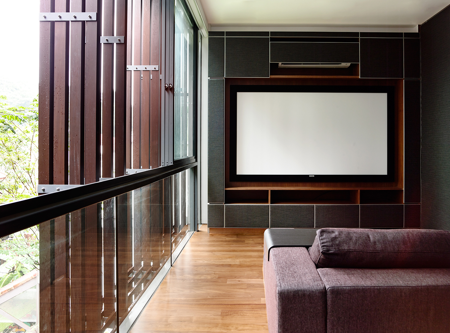 The second storey level of the courtyard lies over the dining area and in front of the master bedroom. The full height glass facade facing the courtyard is screened by interlocking vertical and horizontal timber members.