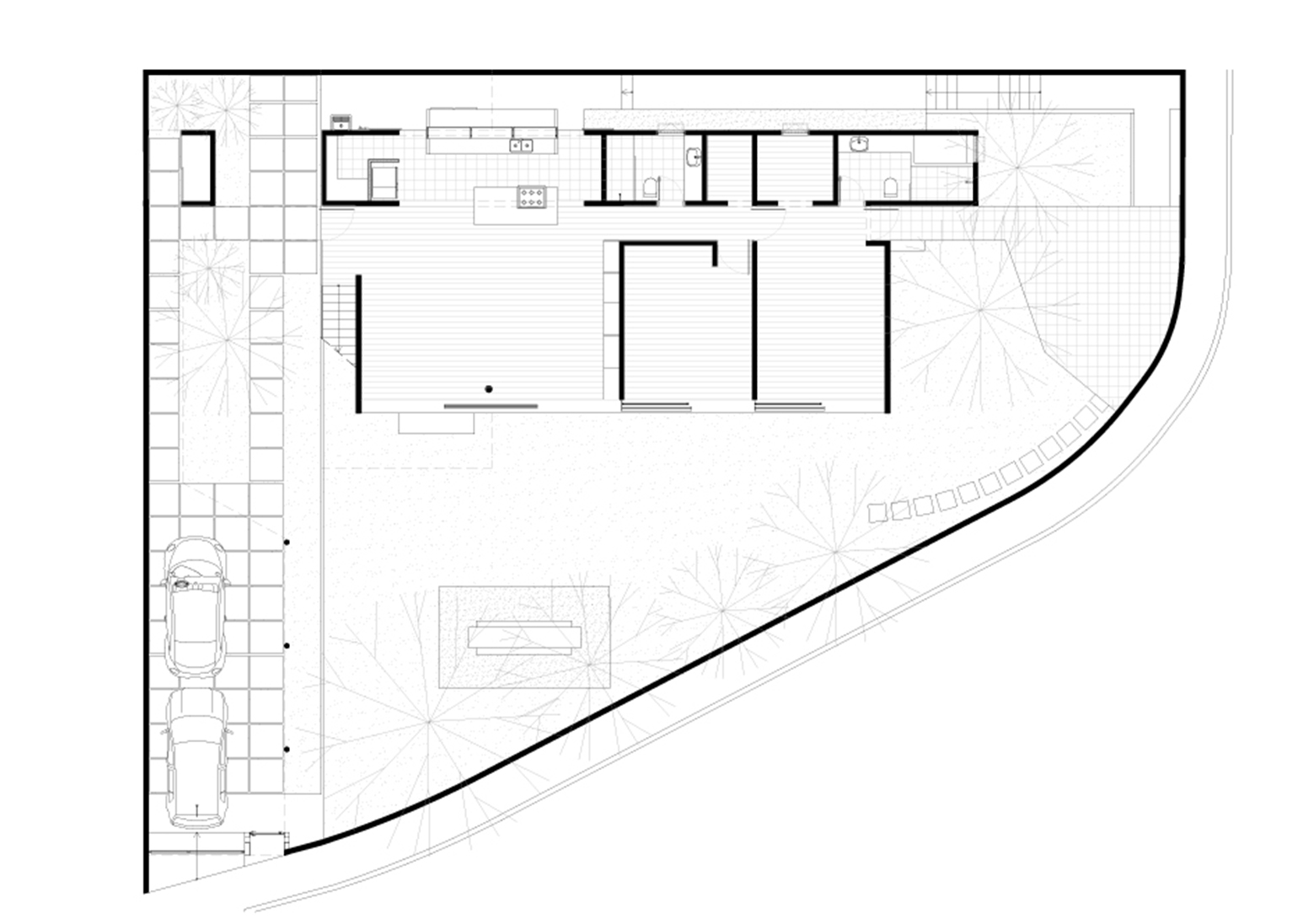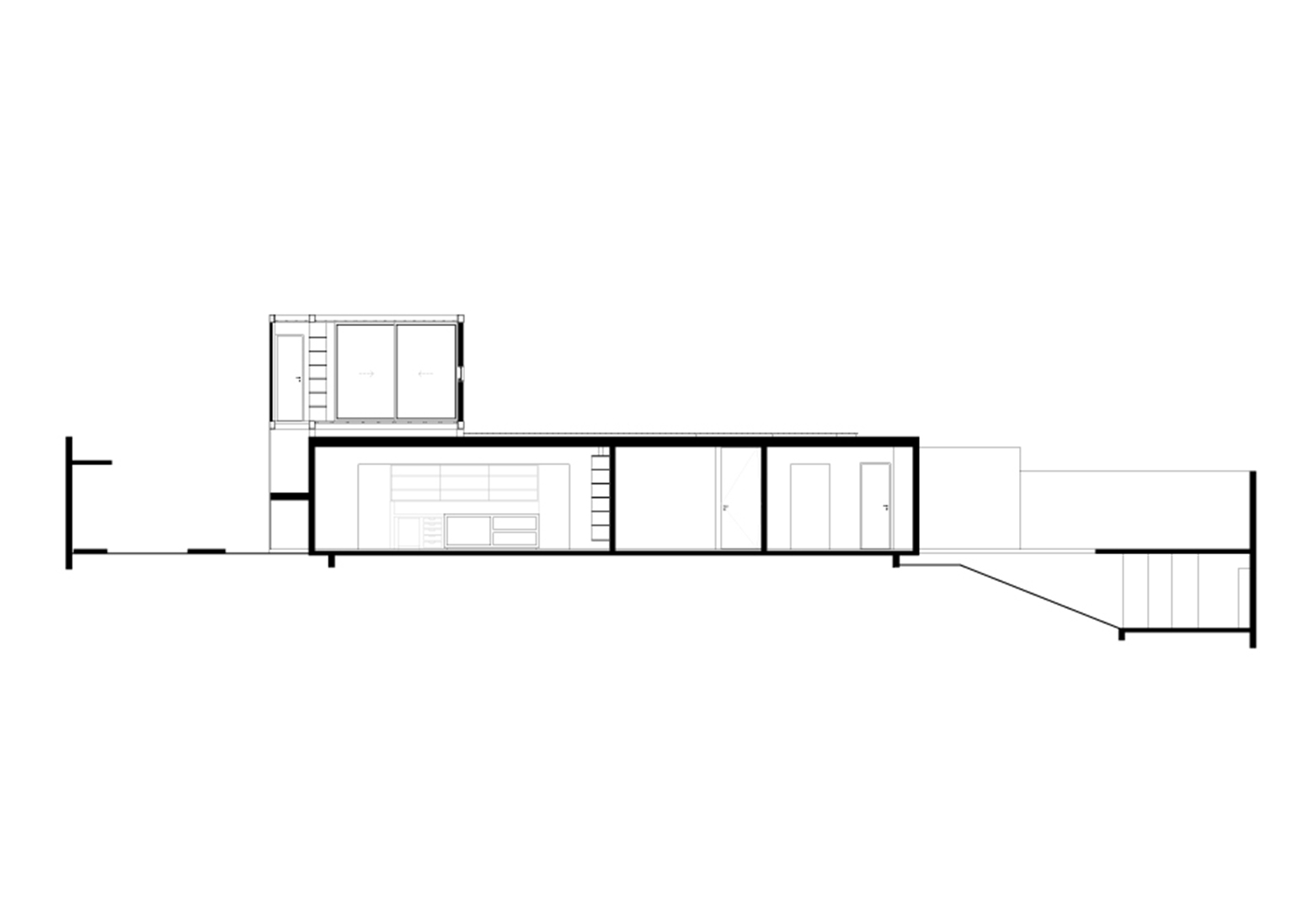 The ground floor embraces the architectonical program of the house and is organized by a longilineal volume that incorporates all of the wet areas; two bathrooms, kitchen and laundry room. This main volume stretches along the whole extension of the house, parallel to the lateral border and demarcating the end and initial point of the terrain.