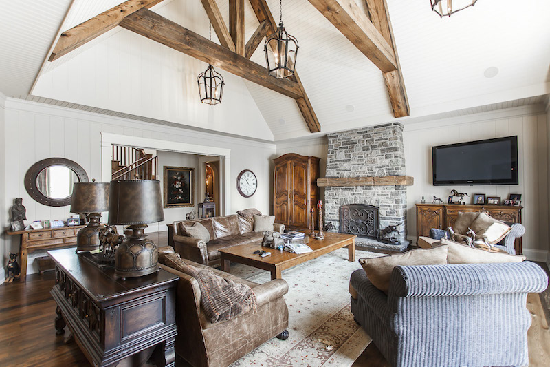 This mix is especially noticeable in the office, which appears to be made completely out of high-end wood, whether we’re talking about the ceiling, floors or walls. However, the ceiling does feature a series of contemporary spotlight-based lighting arrangements that complement a small chandelier. The living room has a large flat screen TV placed alongside a rustic fireplace, while the kitchen boasts wooden cabinetry, chandeliers and state-of-the-art appliances.