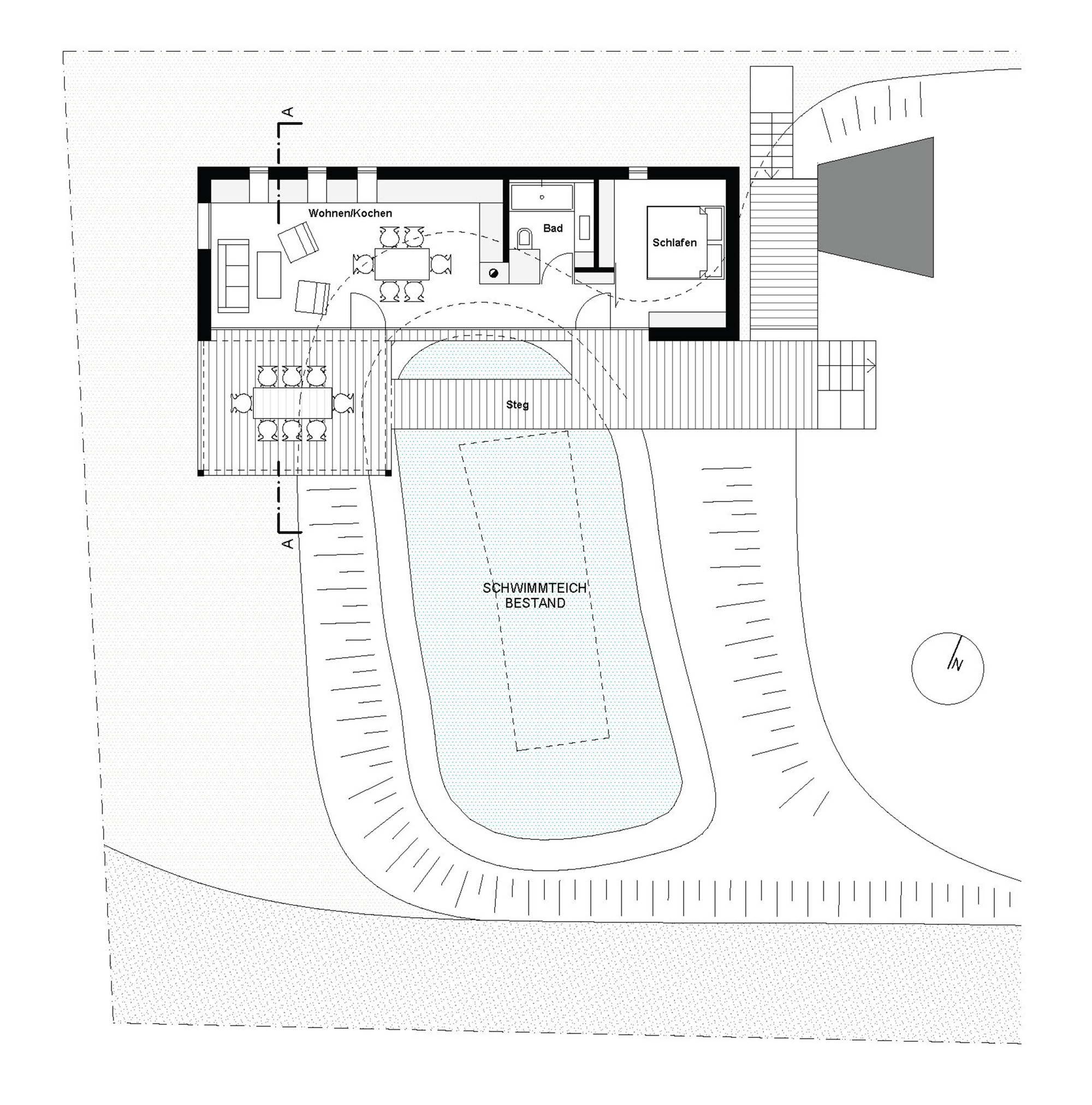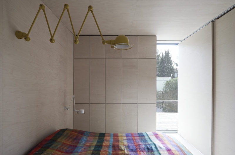 The structure is supported by four pillars, and it blends easily with its surroundings thanks to the natural materials that were used in its construction. Wood was a great choice for the surfaces and bearing structure, while glass (in the form of large windows and sliding doors) was the obvious choice to obtain the illusion of extra space through transparency. The kitchen and a small dining area benefit from plenty of natural light, and they are connected to a wooden outdoor patio that was built at the edge of the pond.