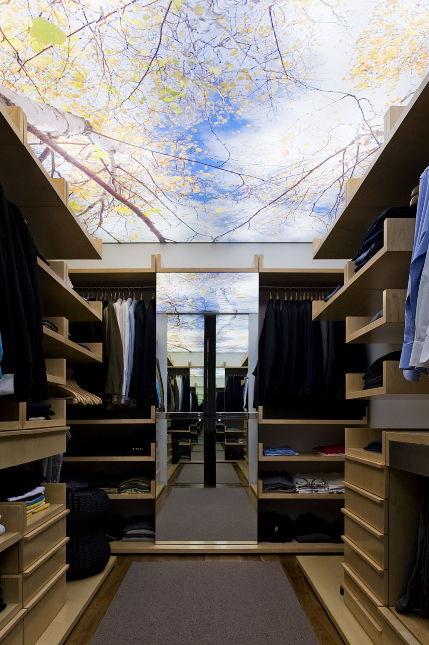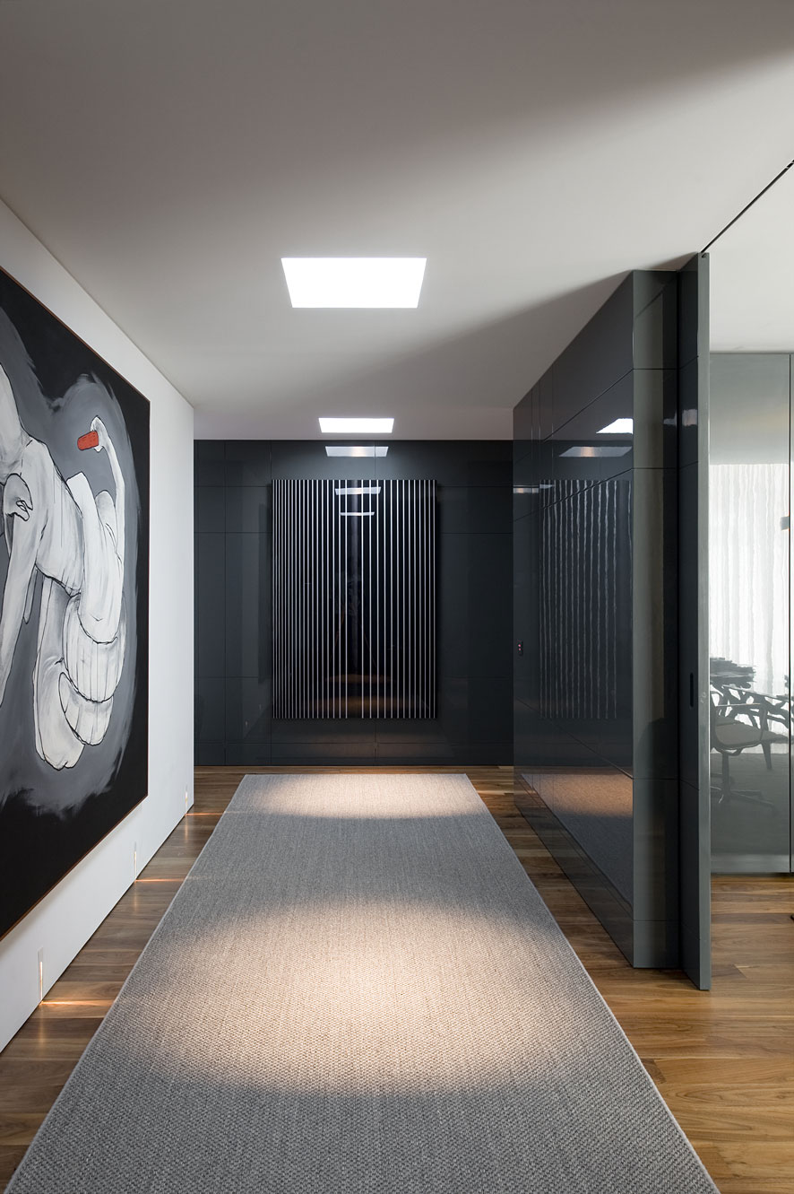 While the part of the house that faces the street is discreet and modest, the opposite side is grand and completely open towards the surroundings. Here the large glass walls of the residence blur the boundaries between indoors and outdoors, inviting dwellers to enjoy both spaces every day.