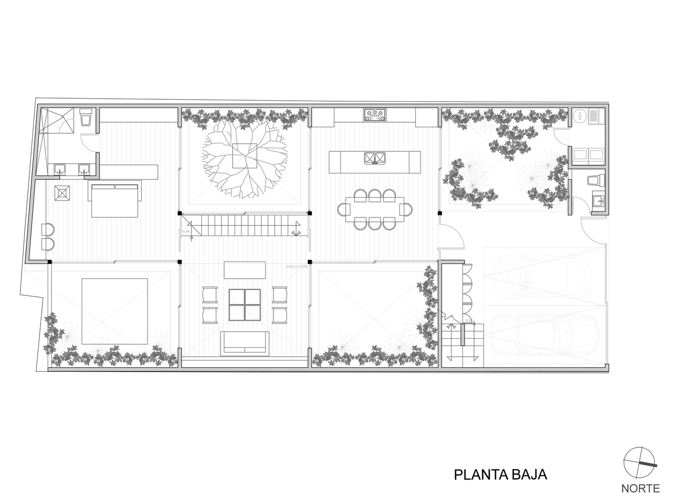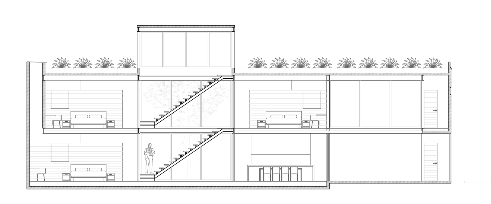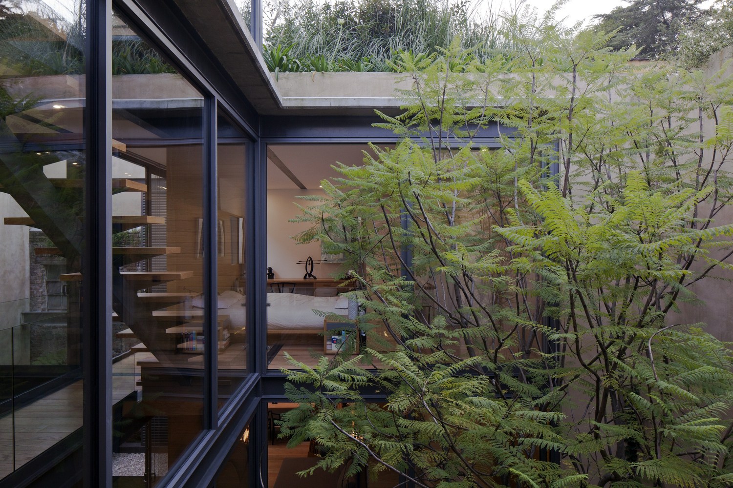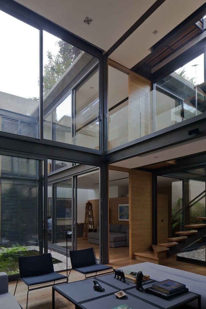 The first floor includes the public living areas such as the kitchen, dining room, study, laundry, parking space and the entryway. The second level incorporates three bedrooms, each with its own bathroom and dressing room. The two floors as well as the courtyards and stairs are linked by the living room, which is a well lit, double height space. Due to the extensive use of glass elements, the vegetation present in the courtyards becomes a part of the house. The roof accommodates a garden that regulates interior temperature and offers great opportunities for relaxation.