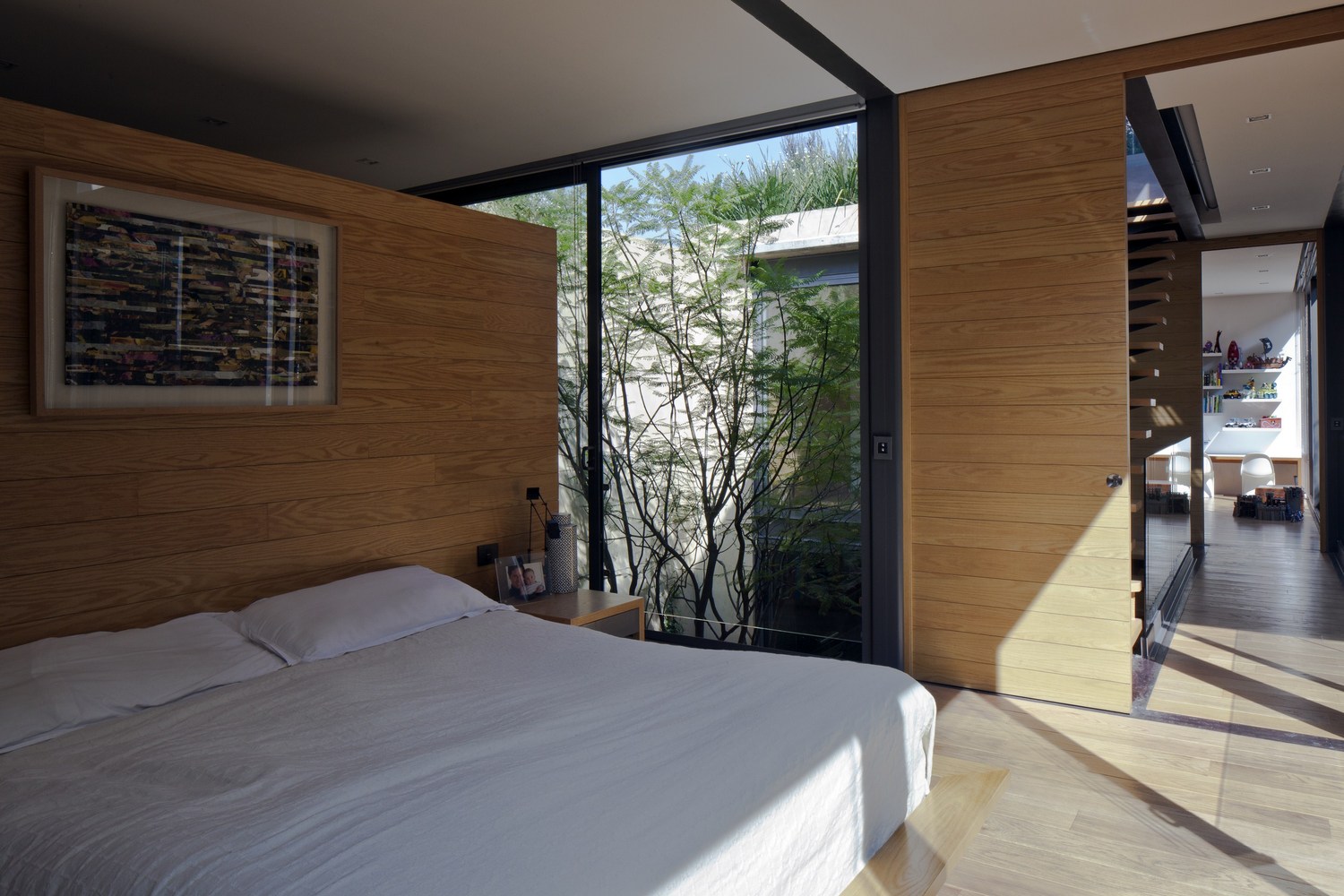 The vegetation of the courtyards becomes a part of the house, giving the impression of living in contact with the outside. Thanks to the courtyards, the sun bathes the house all day creating a play of reflections and shadows that animate the space.
