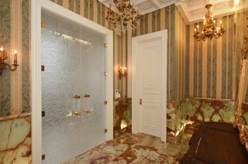 The library, the place where one can feed his mind and soul, is embellished by a travertine fireplace. In the ballroom we find as well an imported Italian fireplace which was assembled during three months.