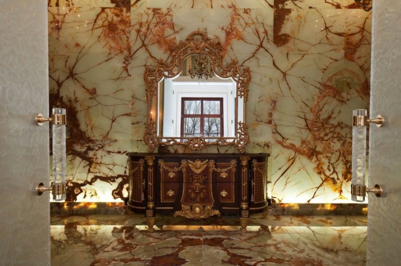 In order for you to notice the impressive features of this residence, we present to you a genuine onyx lounge-like powder room with his and hers closets located on the first level.