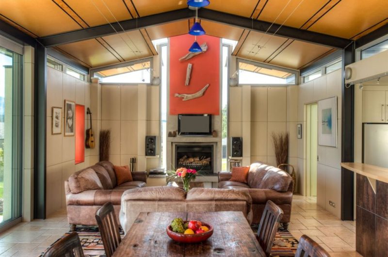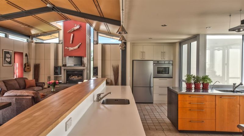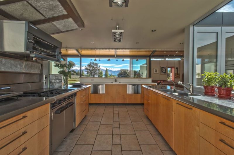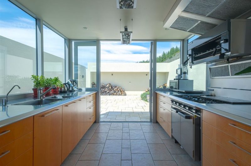 The living areas are focused around the kitchen, offering incredible views of the lake and mountains and over the Rippon vineyard.
