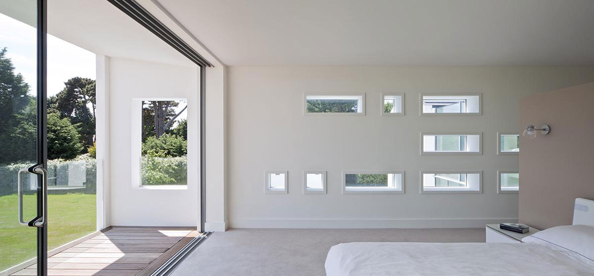 Keeping the bedrooms in the east wing of the house allowed each room to have a spectacular view over St. Brelade’s bay. The Master Bedoom and balcony to the south has a unique and elevated position over the lap pool and uninterrupted views of the coastline.