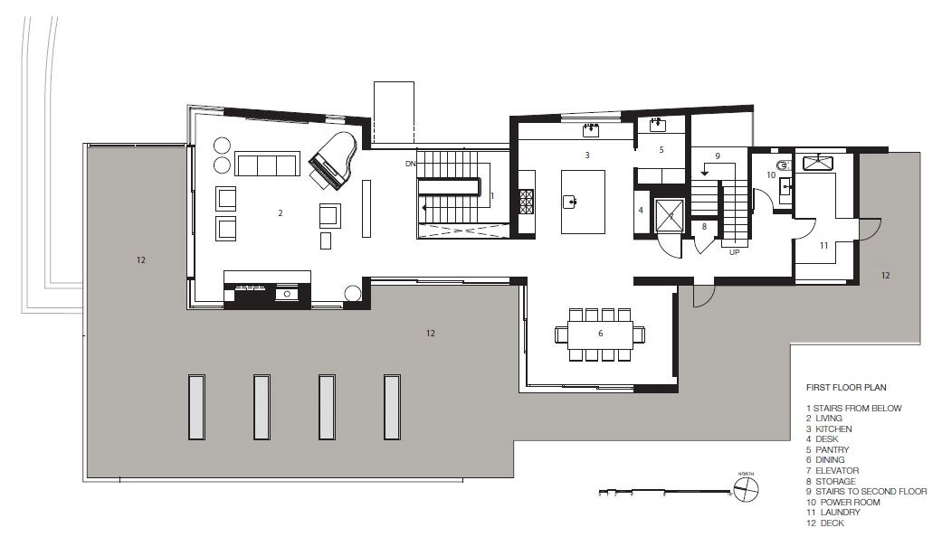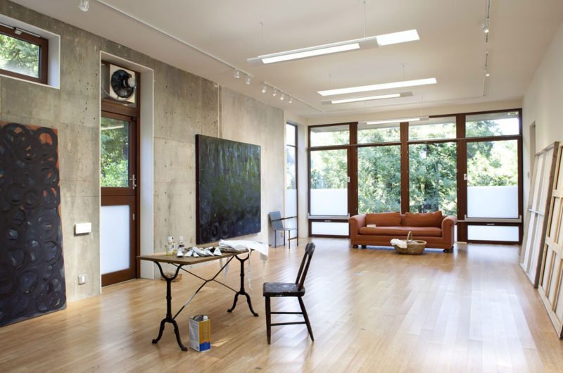 The home is divided into three levels, the lower floor being built into the hillside and the upper two providing incredible views and being flooded by natural light. The first floor accommodates the garage, the entry, the painting studio, the gallery and the guest quarters. The top floor features two bedrooms, the home office and also a ramped bridge that leads to the yard and pool.
