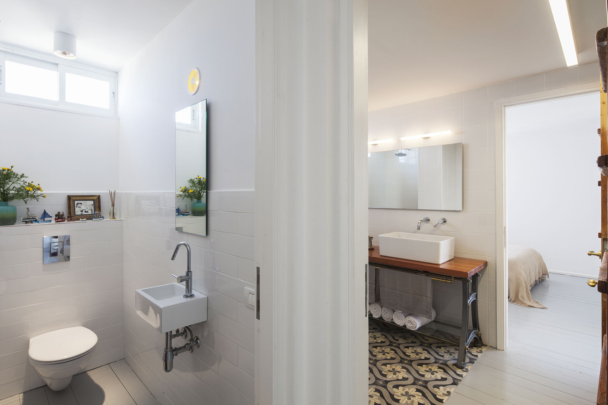 The dining table is in fact a seating bar, a sniper weapon cleaning table; the table is placed on a three-dimensional patterned concrete floor that defines the scope of the kitchen from the rest of the loft space. The work area’s desk is made of oak and was designed by the studio. Crystal lamps from the 50’s were hung on the bare concrete column. A round dining table, purchased in Jaffa’s flea market, is positioned Next to the column, on its other side, and around it are yellow Eames chairs. Dror’s and Shavit’s final thesis from their academic years, are leaned against the living room wall. A large industrial aluminum profiles library is also prominent in the living room, the library was built around the air conditioner and it contains an archive, a library and a presentation of the studio’s projects. The bathroom and toilet doors were purchased at Haifa’s flea market; the doors were dismantled from a 20’s eclectic building and were renovated and refurbished by the studio. The shower floor was designed by Dror, inspired by a Cuban pattern. The sink in this area was placed on a clear pine surface that was to the legs of a diamonds polish machine. Irit Henkin and Zohar Shavit established their office 10 years ago and since then have planned and designed numerous residential projects.