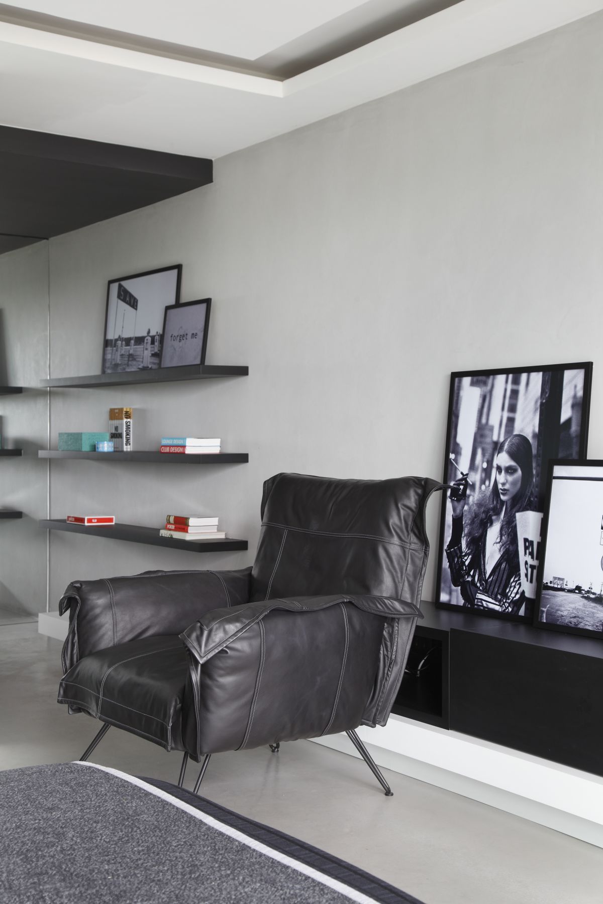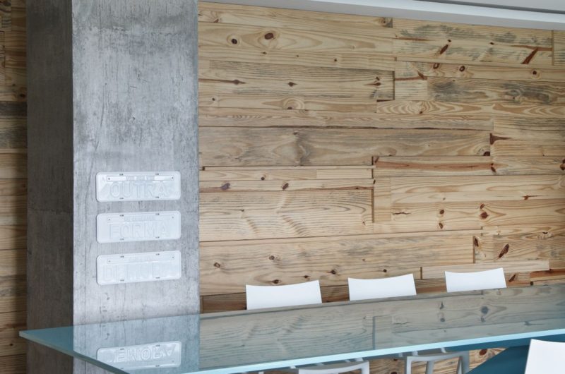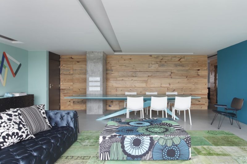 Some of the apartment’s key elements include an exposed structural column at the entry, a pinus wood covered wall, and numerous furniture pieces designed by Studio Guilherme Torres.