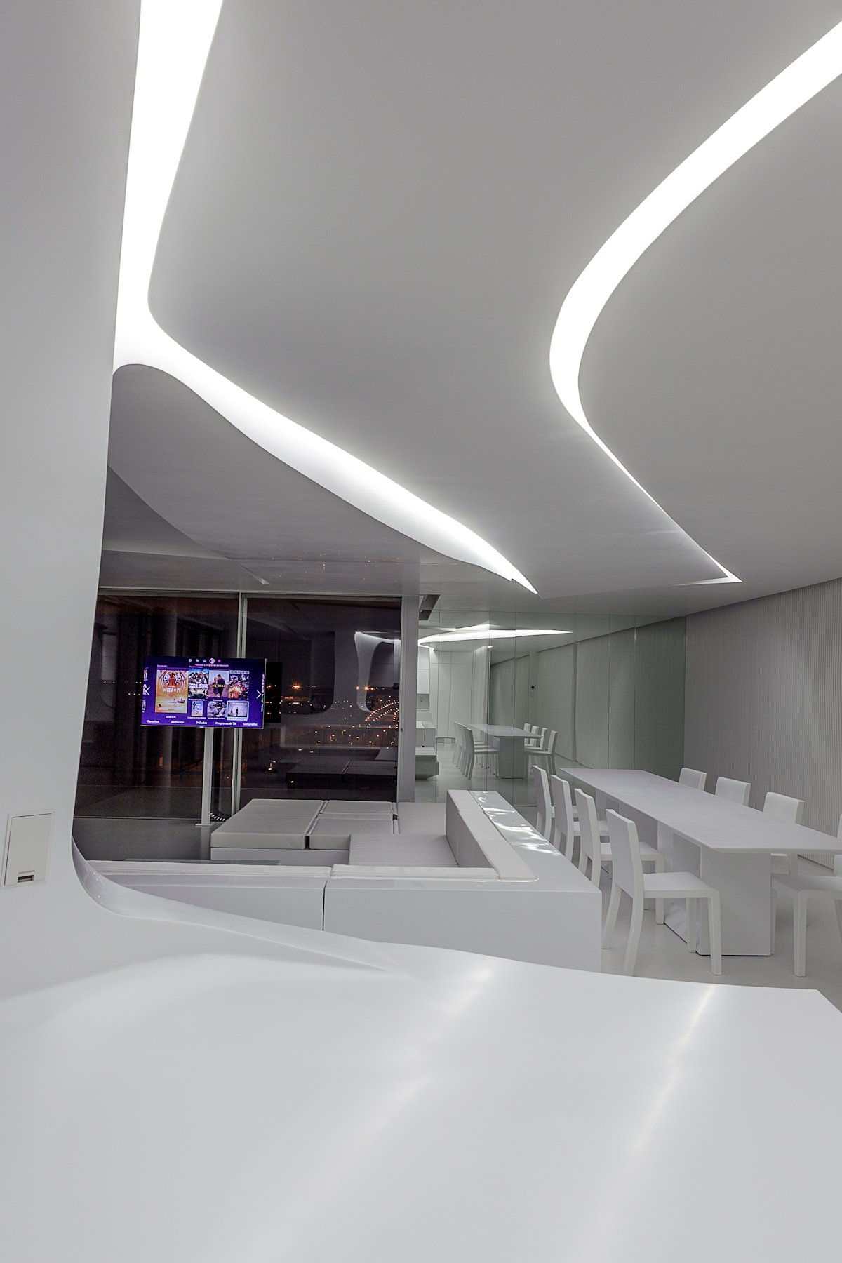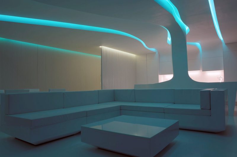 We have designed a ceiling whose curves are resolved in white glow Krion by Porcelanosa. This ceiling goes through walls also, and has indirect LED lighting that changes colour to create different atmospheres and feelings.