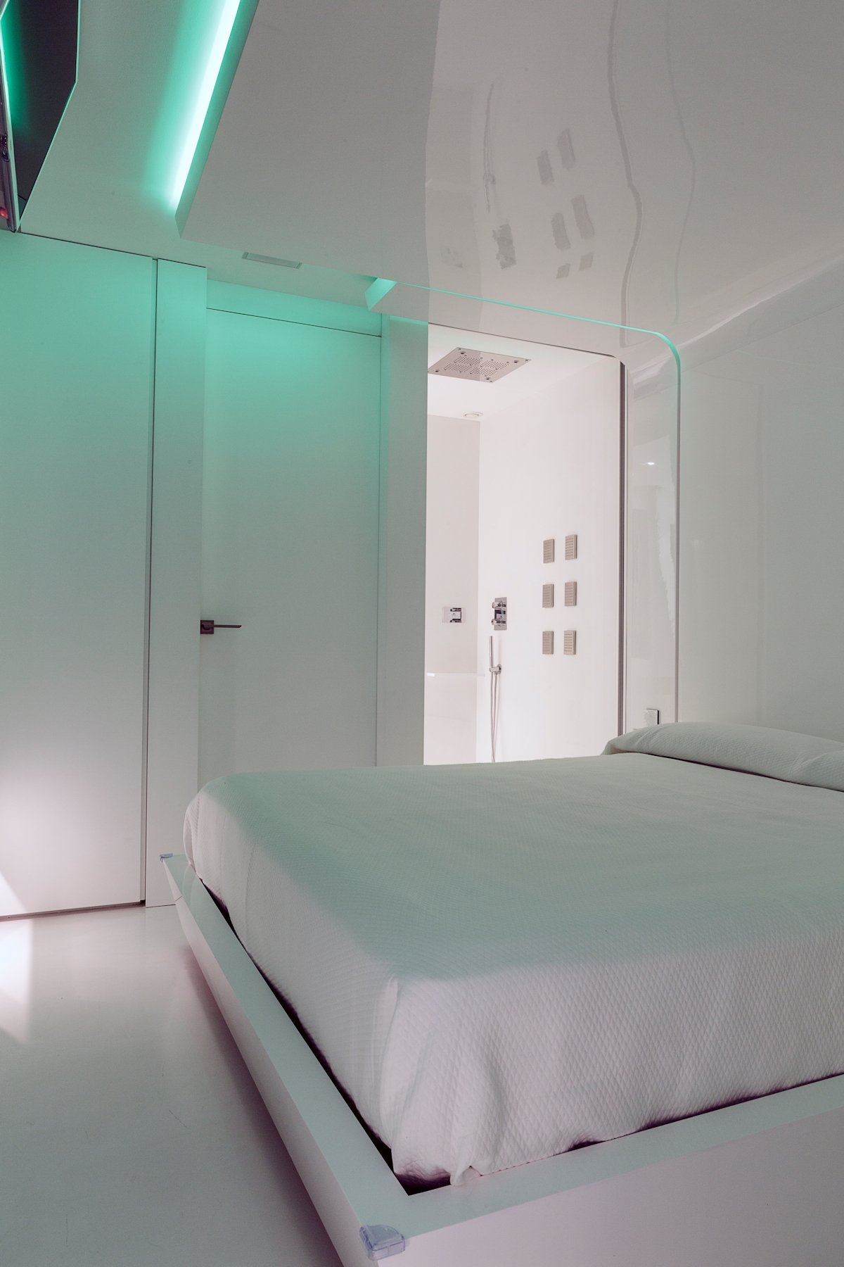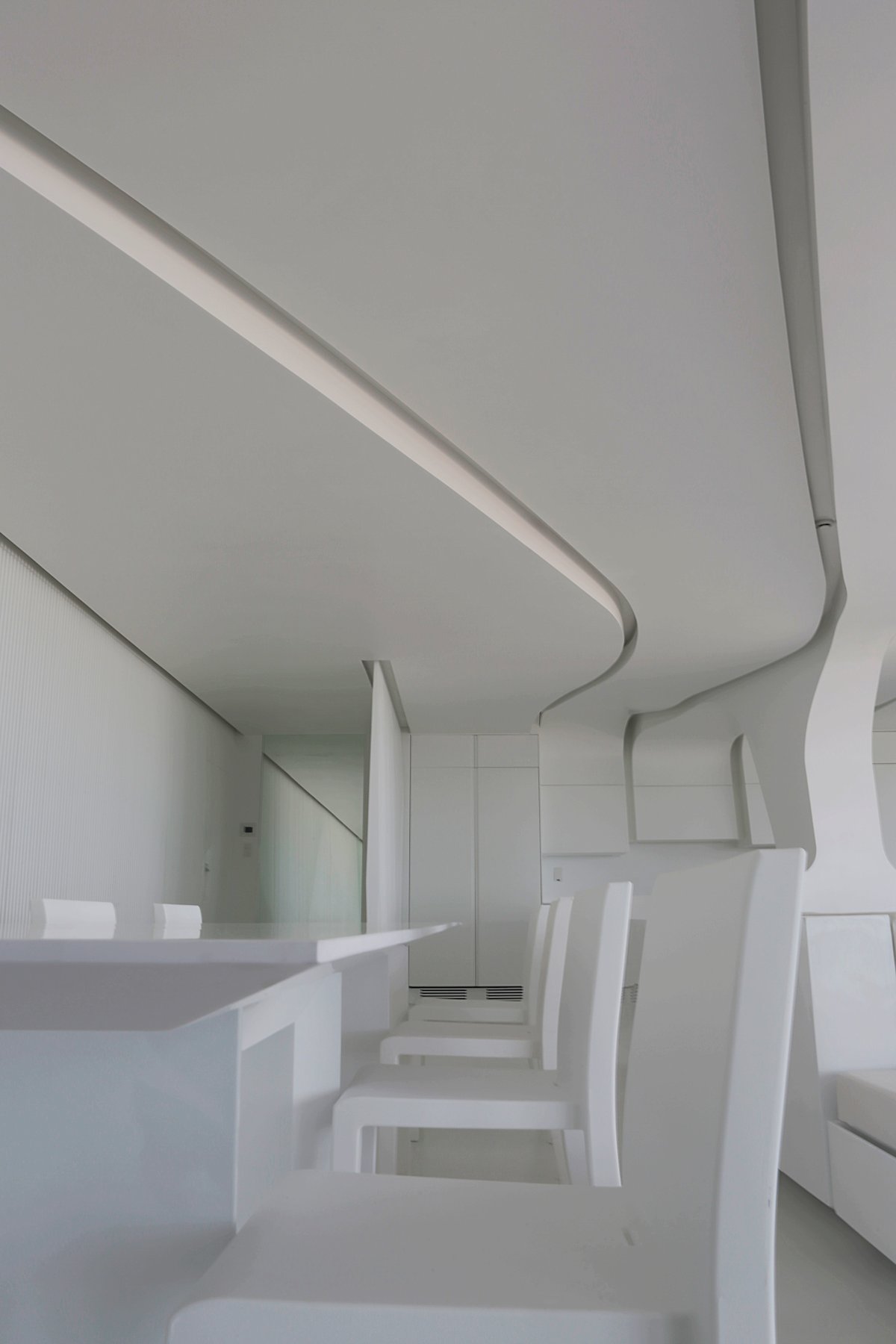 Featuring exceptional views of the sea, the penthouse includes a series of undulating shapes that mimic the waves and their natural motion. The ceiling, for example, boasts a curvaceous design and features a white glow complemented by LED lighting arrangements. These LEDs change color according to the owner’s preference in order to create an exceptional atmosphere. Everything from the closets and dressings to the interior doors boast a white lacquer finish that matches perfectly with the overall pure theme of the abode.