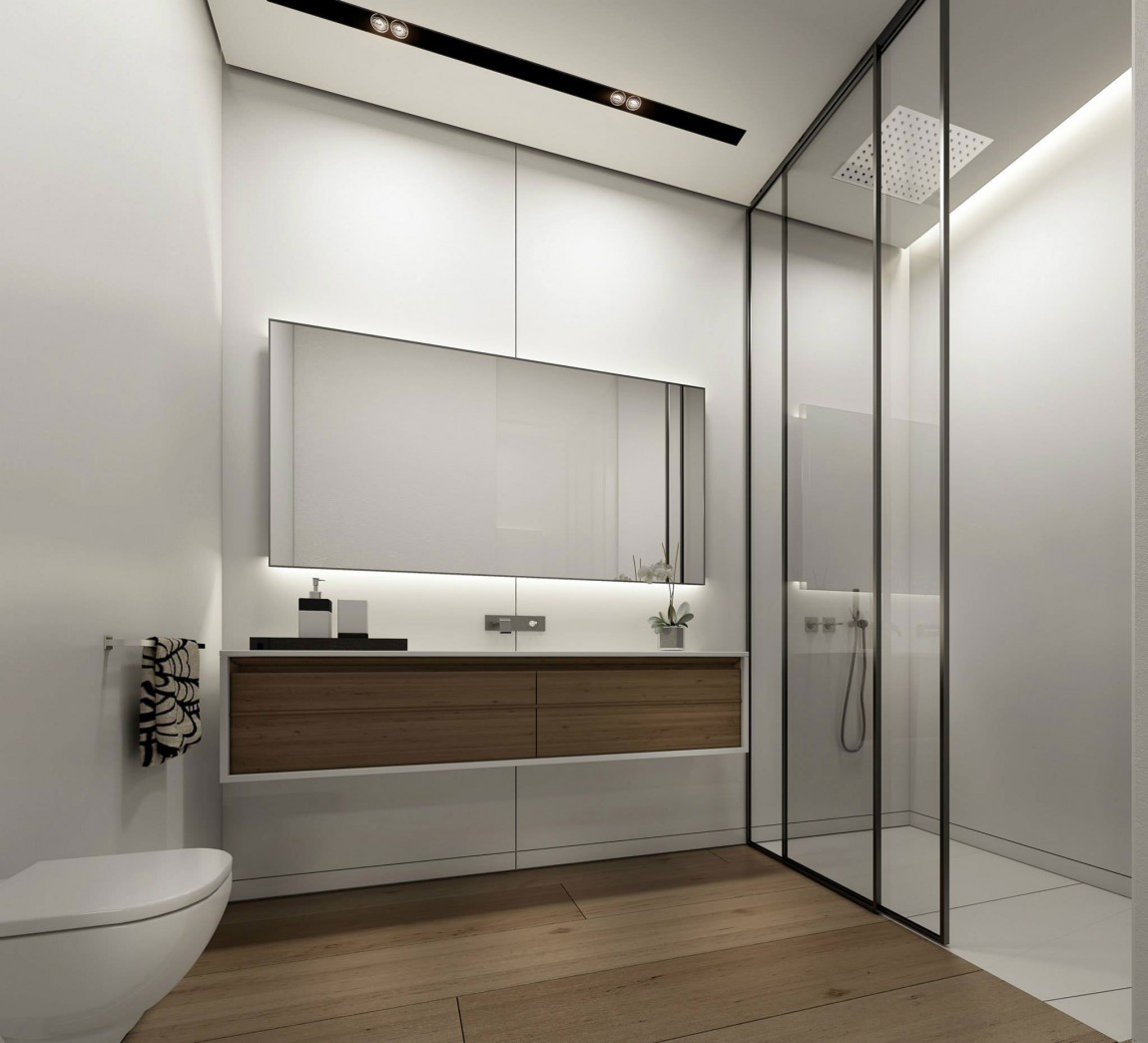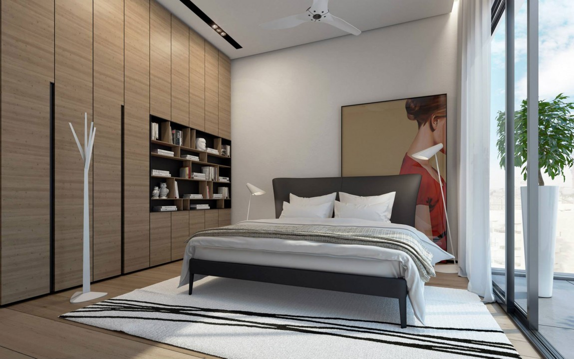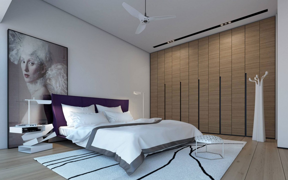 The high quality wooden floors, wooden cabinetry and furniture pieces contrast beautifully with the white, minimalistic appearance of the walls and ceilings. The main bedroom features a large dressing, a comfortable bed and a large, classy painting that pretty much represents the only décor element.