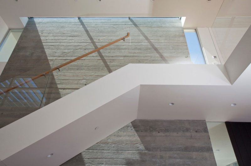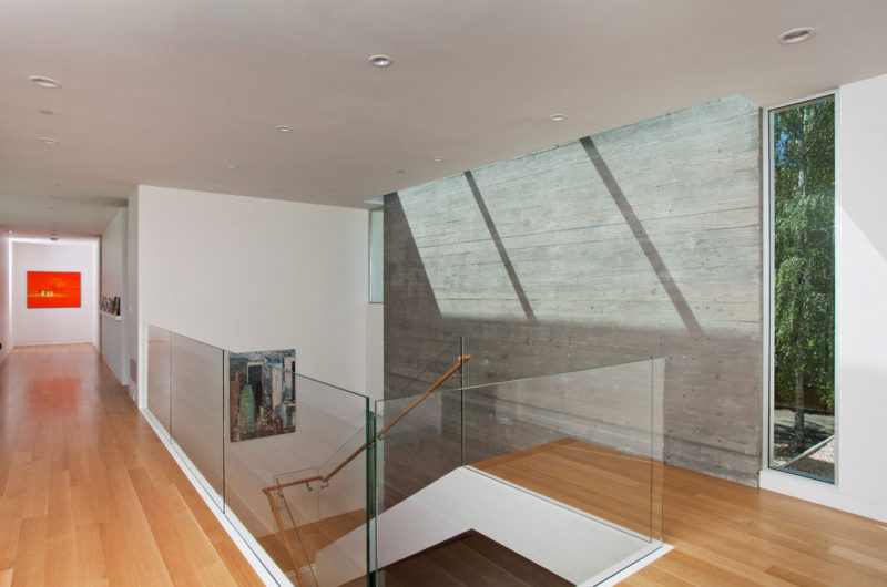 Inside, we find a spacious living room that includes its own fireplace, comfortable sofas and floor-to-ceiling windows. The kitchen is as modern as you would expect from a high-end home, and so it boasts state-of-the-art appliances as well as sturdy counters and high quality cabinetry. The 2 levels are connected via an interior staircase that provides quick and easy access to some of the most important areas within the abode.