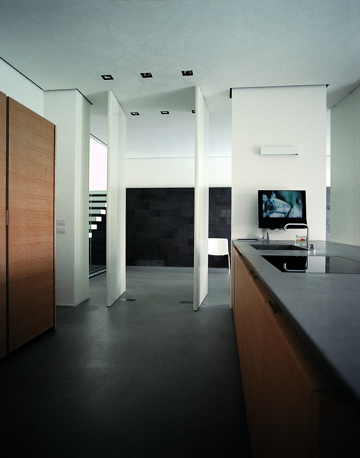 The relationship with nature and the relationship between the interior and exterior of the house are designed in a seamless drawing the frames of the doors along the terraces and loggia of the steel sliding recessed ceiling and floor. The window is then completely hidden in the wall and looking out you can see the hole in the masonry and glass. The simplicity of the space within becomes the theme with which to read and interpret the landscape and this seems to be the character of this house, the purpose for which it was built, the representation of the emotion that space arouses entering it, the vacuum emotional who takes a moment to reason and its relationship with the infinite variation of nature and landscape.