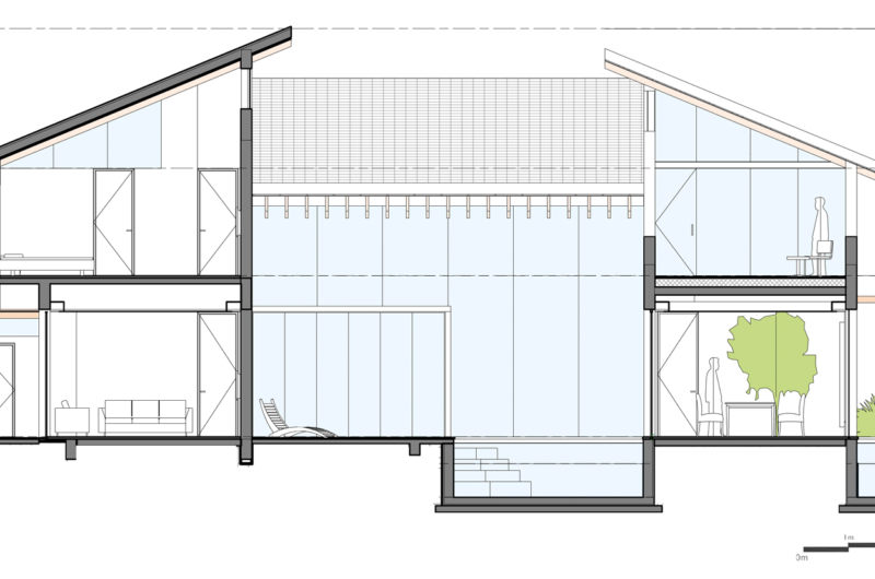 On the inside, we find exquisite accommodation options in the form of 5 bedrooms and 5 bathrooms, but the residence also features its own powder room, staff room and a fully equipped kitchen. The interior arrangements impress with a generous selection of amenities and facilities that ensure a comfortable and laid-back lifestyle. For entertainment and socialization purposes, the dining room was placed at an elevated position above the swimming pool and was adorned with a beautiful tree.