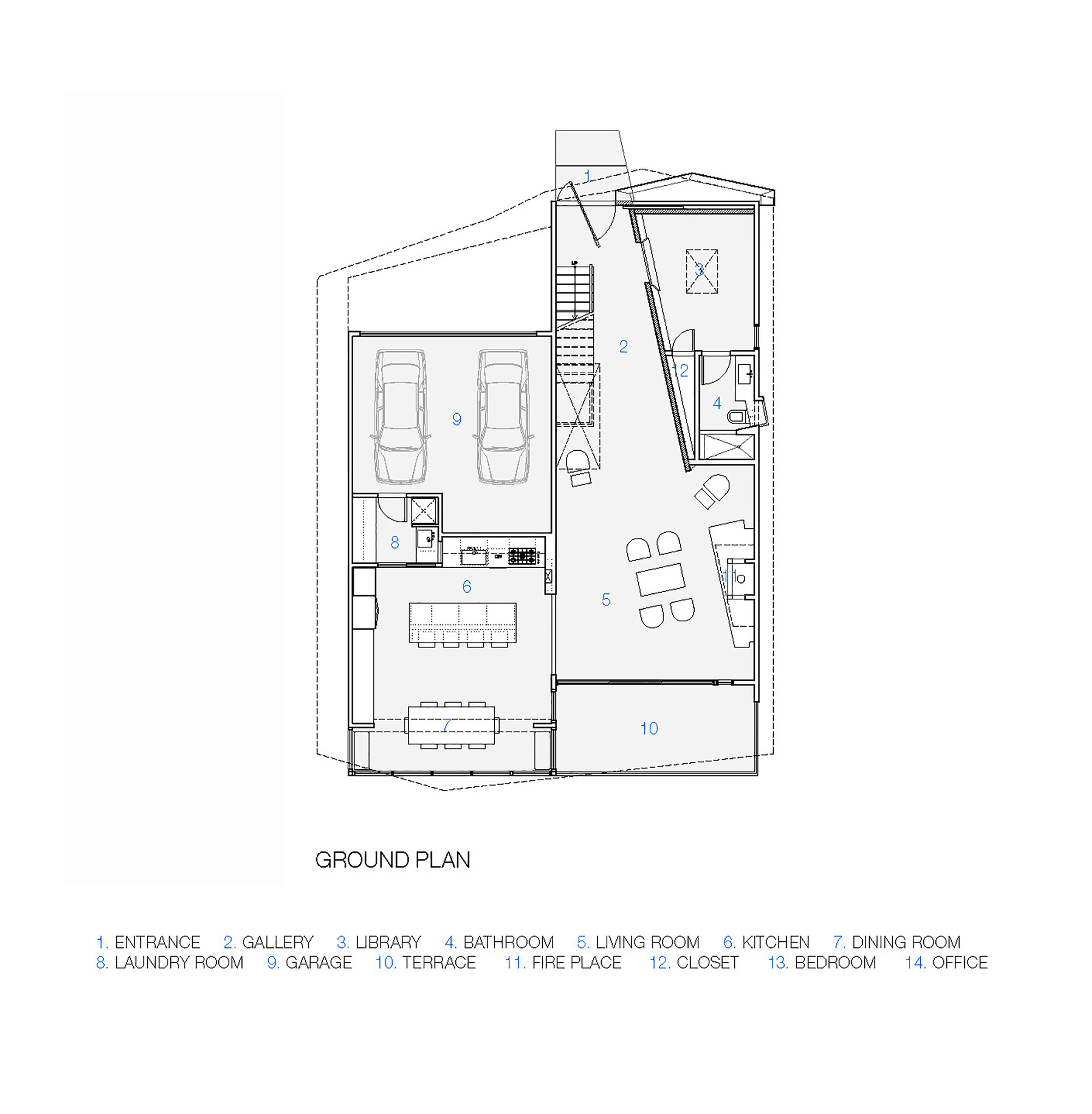 The existing roof geometry is accentuated creating a language of faceted surfaces. The articulated volume of the building’s front facade extends indoors to define the interior spaces, resulting in a dematerialization of the roof, wall and floor planes. A forced perspective is created, framing the extraordinary views out to the Santa Monica Bay.