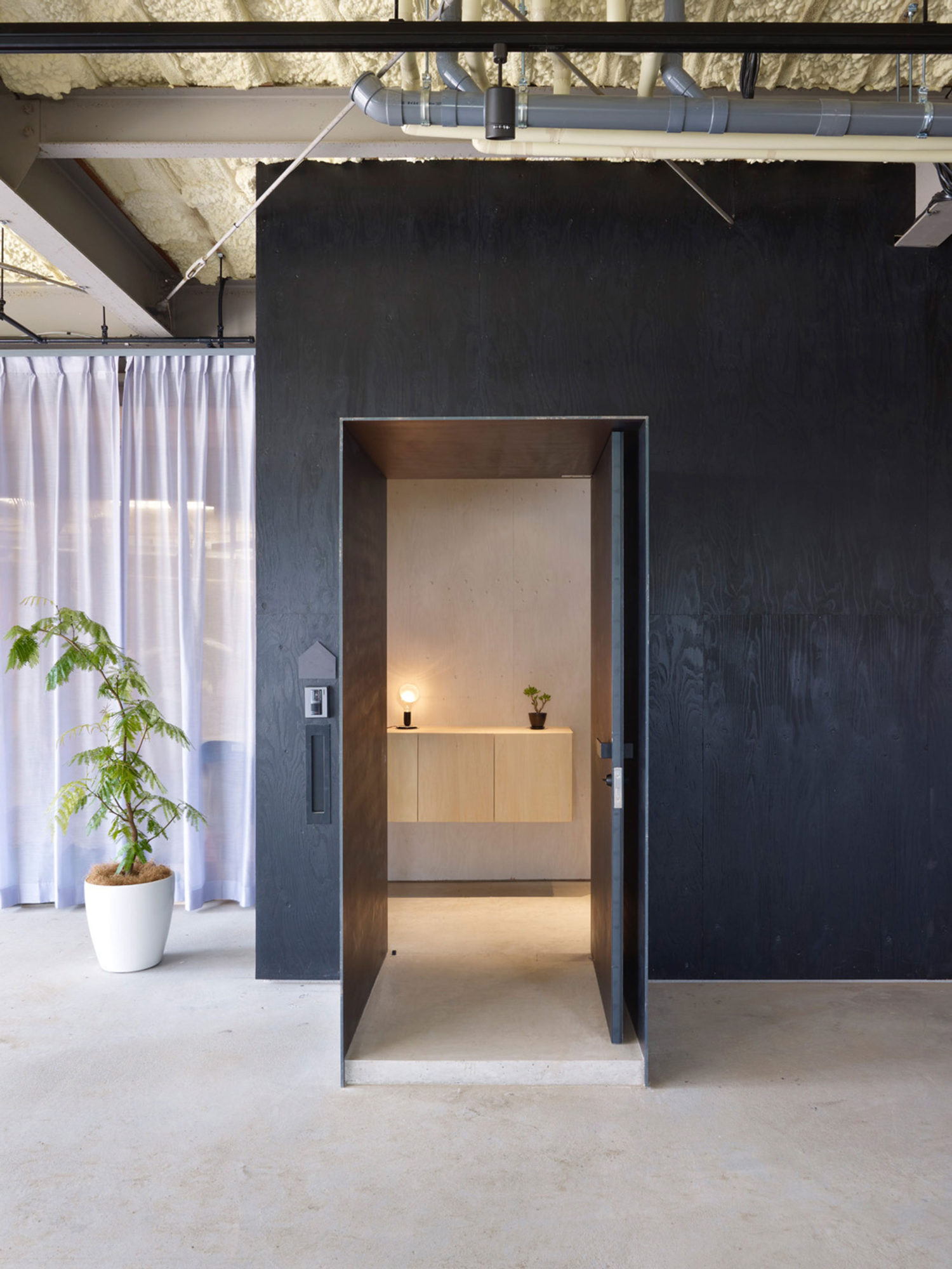 One of our client’s major requirements was for a living space where the presence of the family would always be felt. In response, we devised a single-roomed layout without columns that took advantage of the distinctive features of the existing warehouse. A large kitchen was installed to cater to the needs of the food-loving husband-and-wife couple.