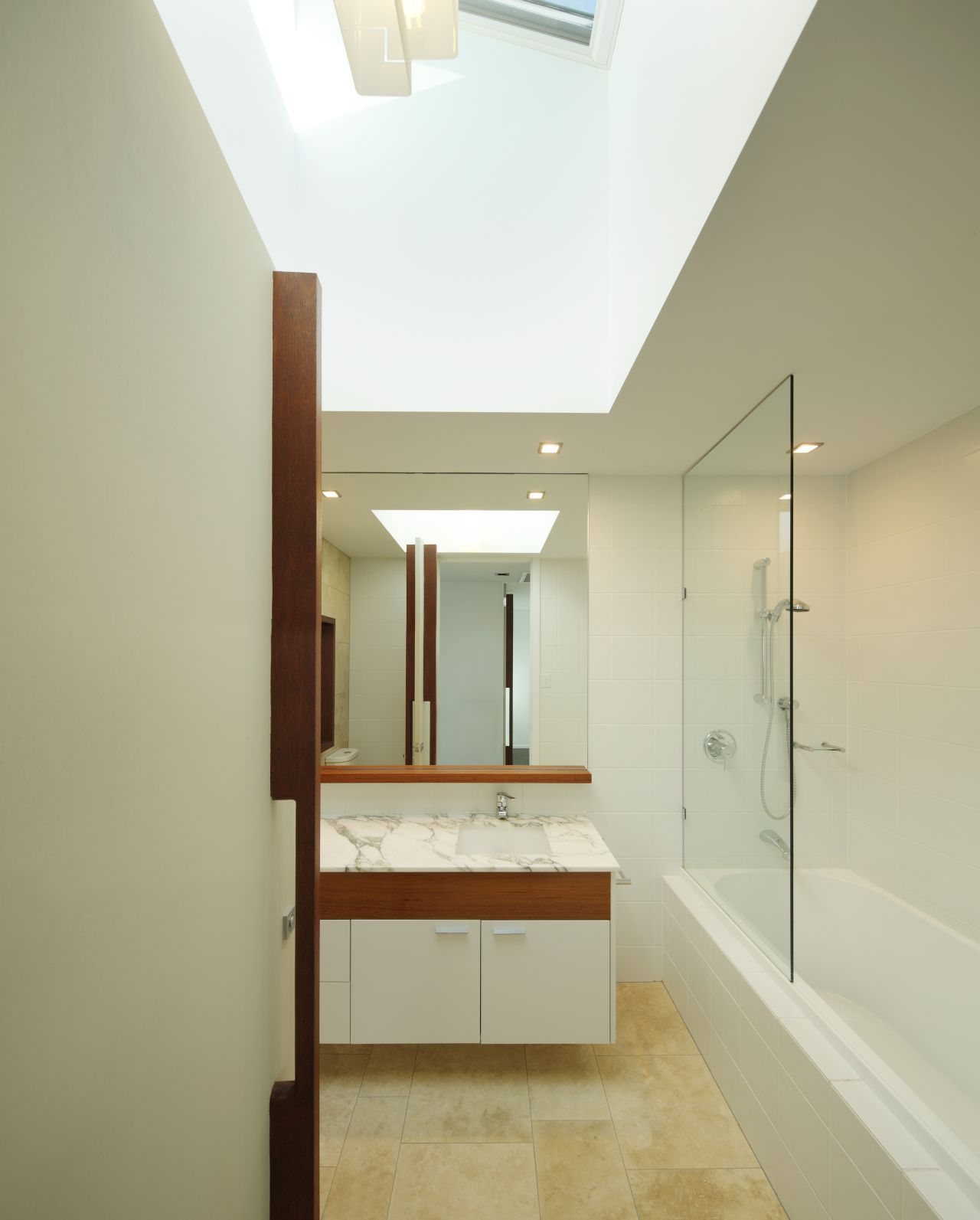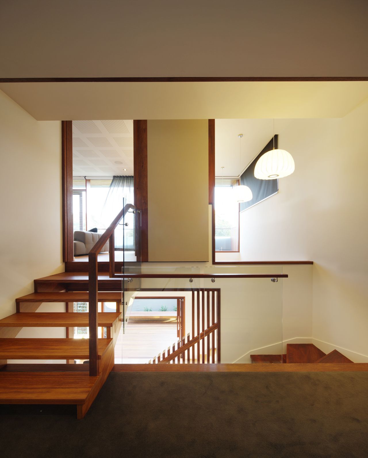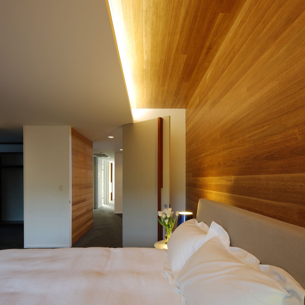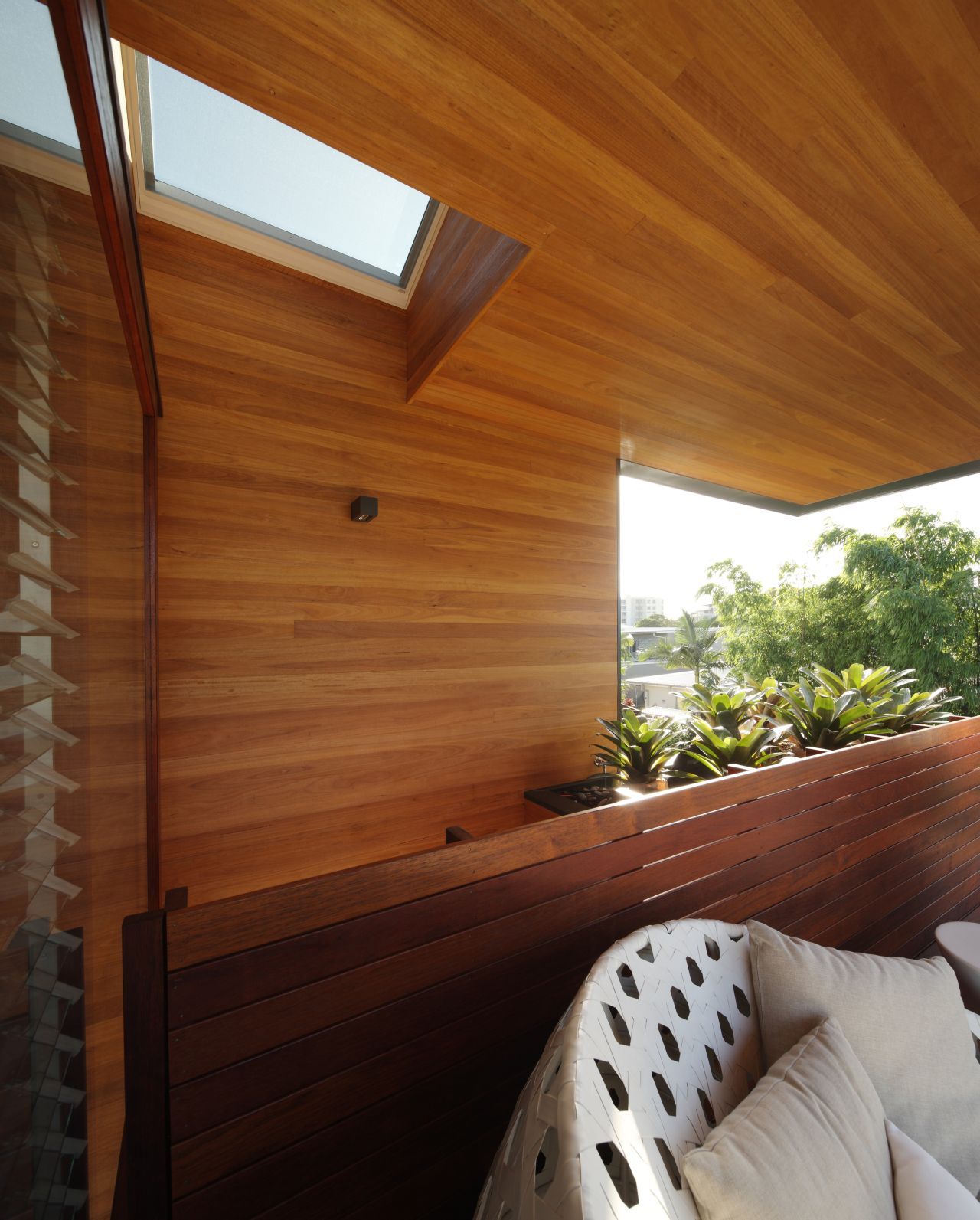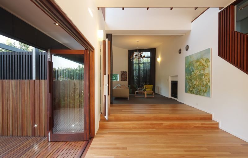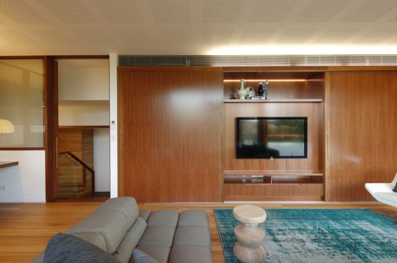 One key modification affected the living/dining/kitchen area, which now affords a better indoor-outdoor communication. The more dramatic alteration revolves around the addition of a Park Room above the existing living areas. This permitted the introduction of several different volumes and voids that help “create a sense of drama”. An excellent result of this alteration is the fact that light can now reach the living spaces below in a beautiful manner.