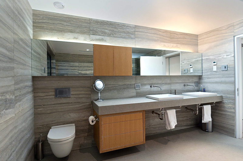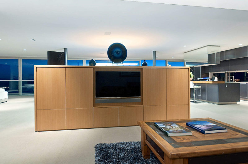 The lower level includes the dining, kitchen and living areas, plus two more en-suited bedrooms. However, the entrance to the house is made through a foyer with a glass roof that allows natural light in. All the rooms are cleverly designed with minimum furniture that blends perfectly in with the walls, and this creates an impression of unlimited space for guests. Moreover, glass walls are used to enhance the beautiful view by connecting the interior with the outside.