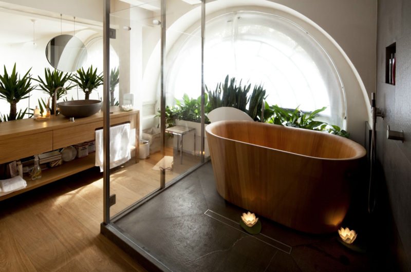 The main room of this home seems to be the kitchen because in here the owner can prepare meals for a large number of people when organizing special occasions. In contrast, the sleeping area is a nice, private, inviolable area where only the owner has access. As in the Japanese tradition, the bathroom recalls the thermal baths in stone and wood, with a wide pool and relaxing lighting.