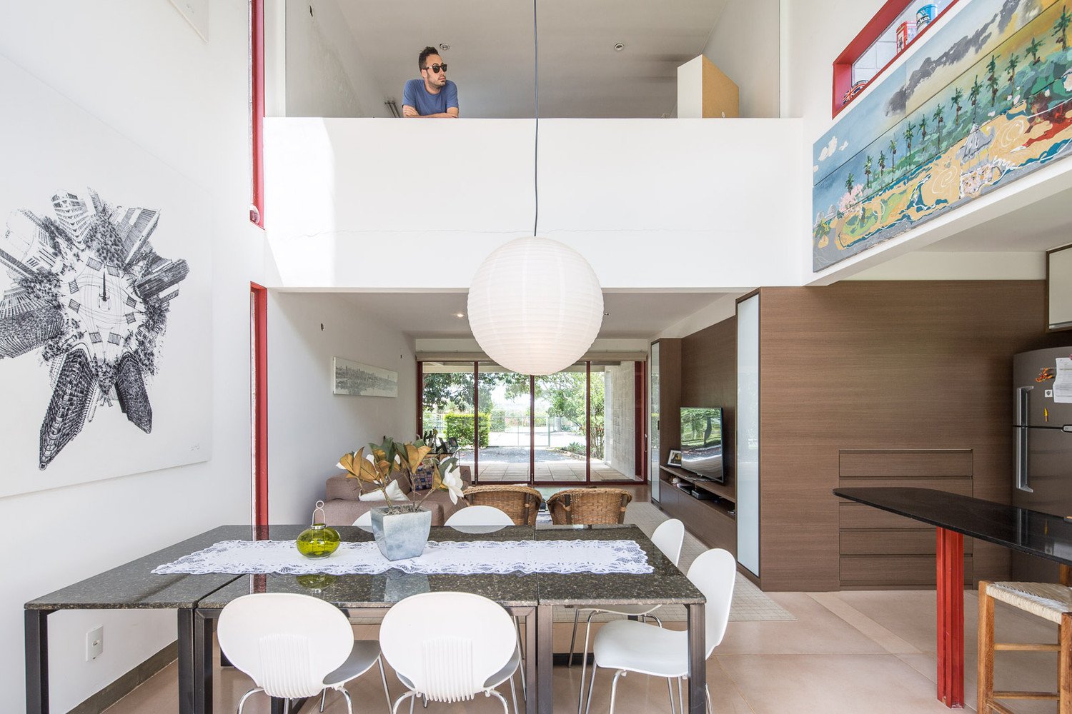 A longitudinal volume includes wet areas and the stairs, while the living room and bedroom, in different levels, are integrated through a double height.