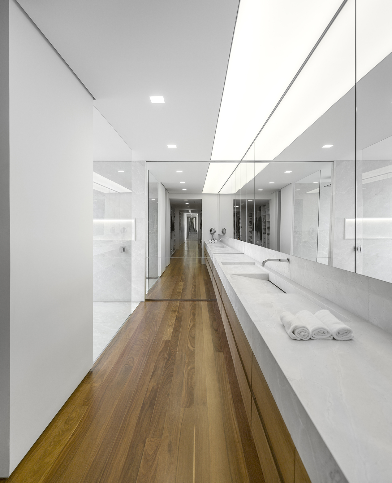 This was possible thanks to the ingenuity of the architects who decided to place the entrance, social areas and swimming pool at an elevated location on the second floor. Furthermore, the abode features multiple glass panels that efficiently blur the limits between the indoors and outdoors. The home office and the master suite can be found at the third floor and boast great views of the endless horizon.